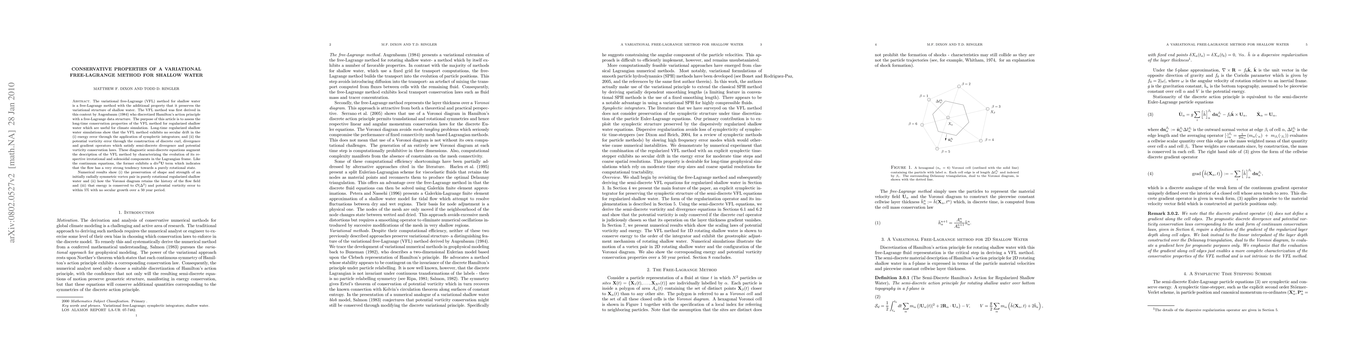 The variational free-Lagrange (VFL) method for shallow water is a free-Lagrange method with the additional property that it preserves the variational structure of shallow water. The VFL method was first derived in this context by \cite{AUG84} who discretized Hamilton's action principle with a free-Lagrange data structure. The purpose of this article is to assess the long-time conservation properties of the VFL method for regularized shallow water which are useful for climate simulation. Long-time regularized shallow water simulations show that the VFL method exhibits no secular drift in the (i) energy error through the application of symplectic integrators; and (ii) the potential vorticity error through the construction of discrete curl, divergence and gradient operators which satisfy semi-discrete divergence and potential vorticity conservation laws. These diagnostic semi-discrete equations augment the description of the VFL method by characterizing the evolution of its respective irrotational and solenoidal components in the Lagrangian frame. Like the continuum equations, the former exhibits a $\text{div}^2\mathbf{U}$ term which indicates that the flow has a very strong tendency towards a purely rotational state. Numerical results show (i) the preservation of shape and strength of an initially radially symmetric vortex pair in purely rotational regularized shallow water and (ii) how the Voronoi diagram retains the history of the flow field and (iii) that energy is conserved to $\mathcal{O}(\Delta^2)$ and potential vorticity error to within 5% with no secular growth over a 50 year period.