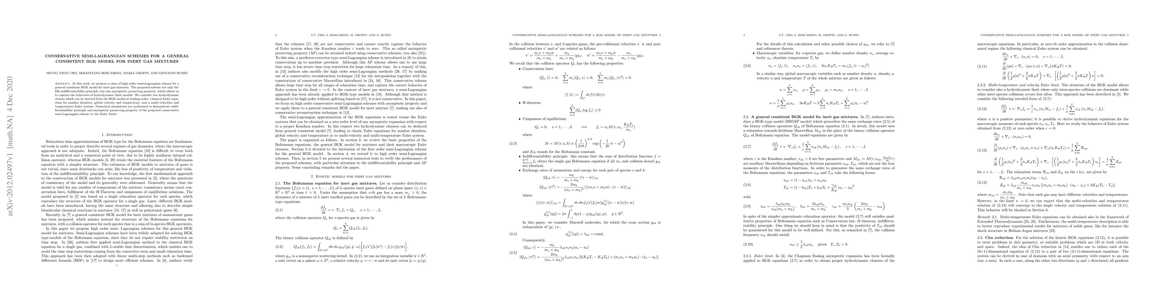 In this work, we propose a class of high order semi-Lagrangian scheme for a general consistent BGK model for inert gas mixtures. The proposed scheme not only fulfills indifferentiability principle, but also asymptotic preserving property, which allows us to capture the behaviors of hydrodynamic limit models. We consider two hydrodynamic closure which can be derived from the BGK model at leading order: classical Euler equations for number densities, global velocity and temperature, and a multi-velocities and temperatures Euler system. Numerical simulations are performed to demonstrate indifferentiability principle and asymptotic preserving property of the proposed conservative semi-Lagrangian scheme to the Euler limits.
