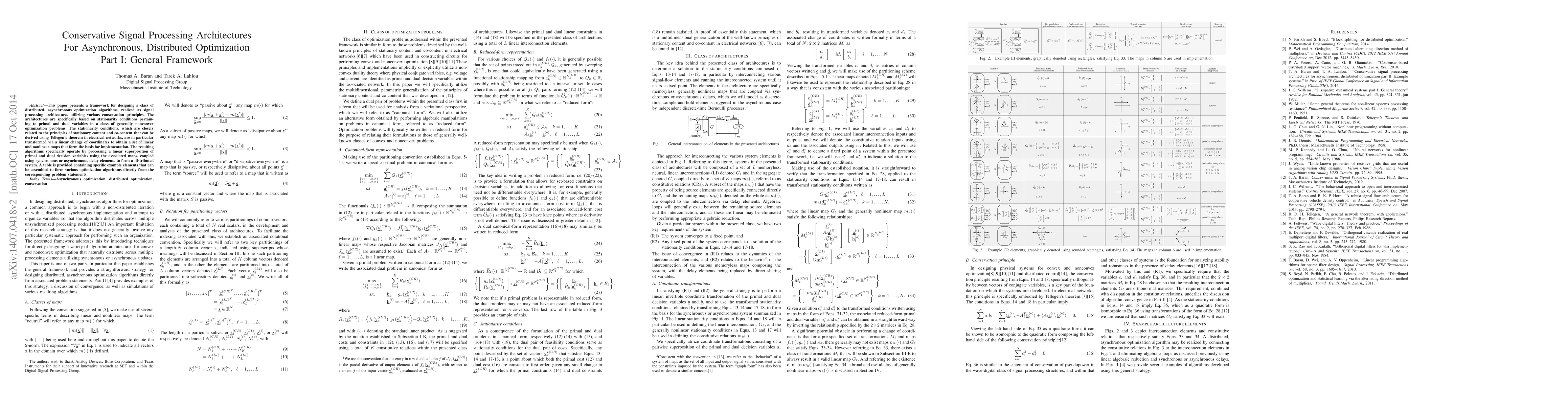 This paper presents a framework for designing a class of distributed, asynchronous optimization algorithms, realized as signal processing architectures utilizing various conservation principles. The architectures are specifically based on stationarity conditions pertaining to primal and dual variables in a class of generally nonconvex optimization problems. The stationarity conditions, which are closely related to the principles of stationary content and co-content that can be derived using Tellegen's theorem in electrical networks, are in particular transformed via a linear change of coordinates to obtain a set of linear and nonlinear maps that form the basis for implementation. The resulting algorithms specifically operate by processing a linear superposition of primal and dual decision variables using the associated maps, coupled using synchronous or asynchronous delay elements to form a distributed system. A table is provided containing specific example elements that can be assembled to form various optimization algorithms directly from the corresponding problem statements.
