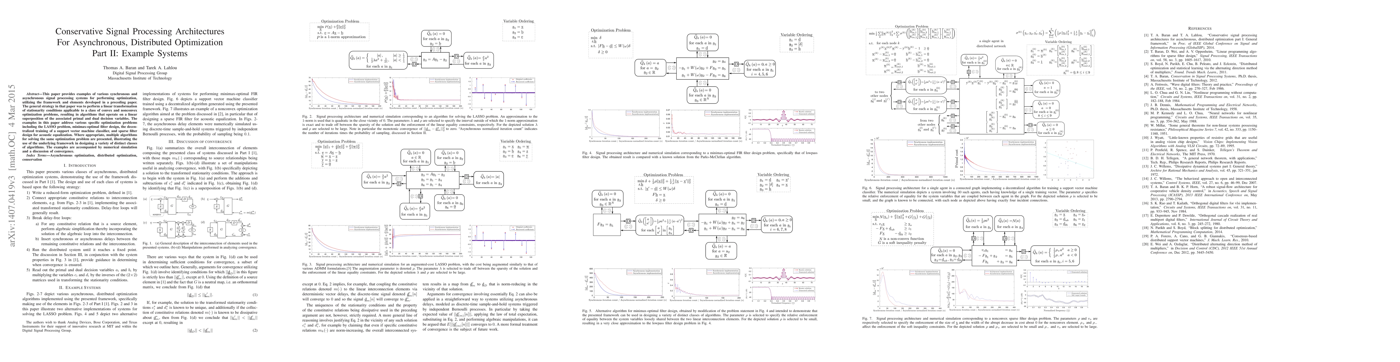 This paper provides examples of various synchronous and asynchronous signal processing systems for performing optimization, utilizing the framework and elements developed in a preceding paper. The general strategy in that paper was to perform a linear transformation of stationarity conditions applicable to a class of convex and nonconvex optimization problems, resulting in algorithms that operate on a linear superposition of the associated primal and dual decision variables. The examples in this paper address various specific optimization problems including the LASSO problem, minimax-optimal filter design, the decentralized training of a support vector machine classifier, and sparse filter design for acoustic equalization. Where appropriate, multiple algorithms for solving the same optimization problem are presented, illustrating the use of the underlying framework in designing a variety of distinct classes of algorithms. The examples are accompanied by numerical simulation and a discussion of convergence.