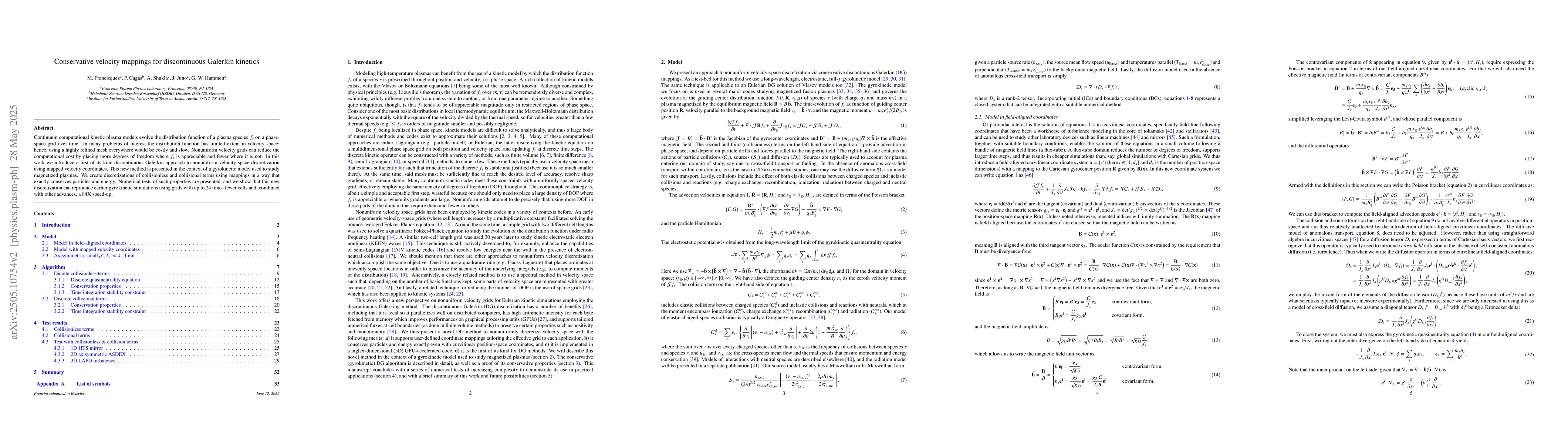 This research presents a novel approach by combining discontinuous Galerkin methods with mapped velocity coordinates for velocity-space discretization, which was not previously done in kinetic plasma models.