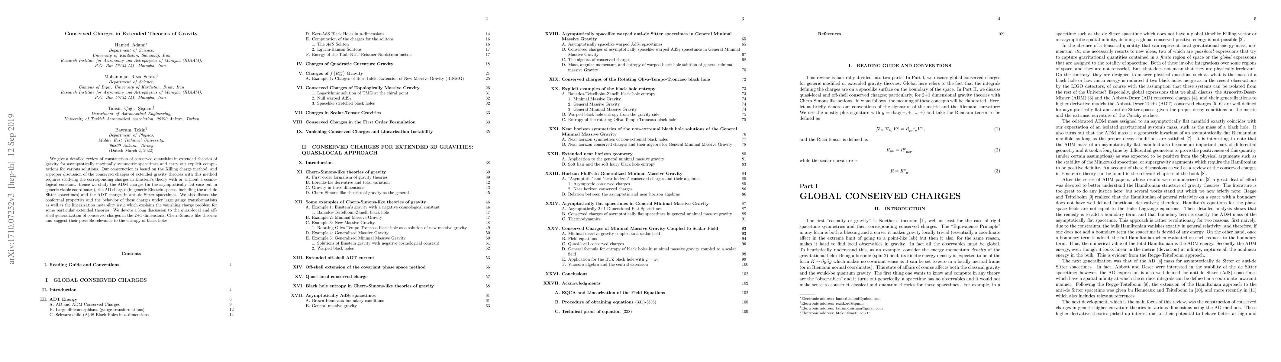 This paper reviews the construction of conserved quantities in extended gravity theories using the Killing charge method, focusing on asymptotically maximally symmetric spacetimes. It discusses ADM, AD, and ADT charges, explores their conformal properties, and addresses issues like linearization instability and the vanishing charge problem, while also considering quasi-local charges in 2+1 dimensional theories.