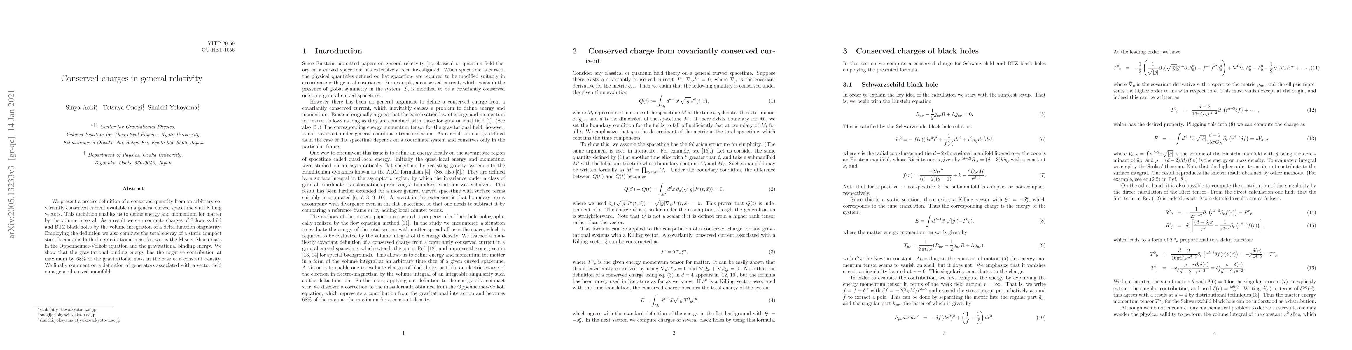 We present a precise definition of a conserved quantity from an arbitrary covariantly conserved current available in a general curved spacetime with Killing vectors. This definition enables us to define energy and momentum for matter by the volume integral. As a result we can compute charges of Schwarzschild and BTZ black holes by the volume integration of a delta function singularity. Employing the definition we also compute the total energy of a static compact star. It contains both the gravitational mass known as the Misner-Sharp mass in the Oppenheimer-Volkoff equation and the gravitational binding energy. We show that the gravitational binding energy has the negative contribution at maximum by 68% of the gravitational mass in the case of a constant density. We finally comment on a definition of generators associated with a vector field on a general curved manifold.