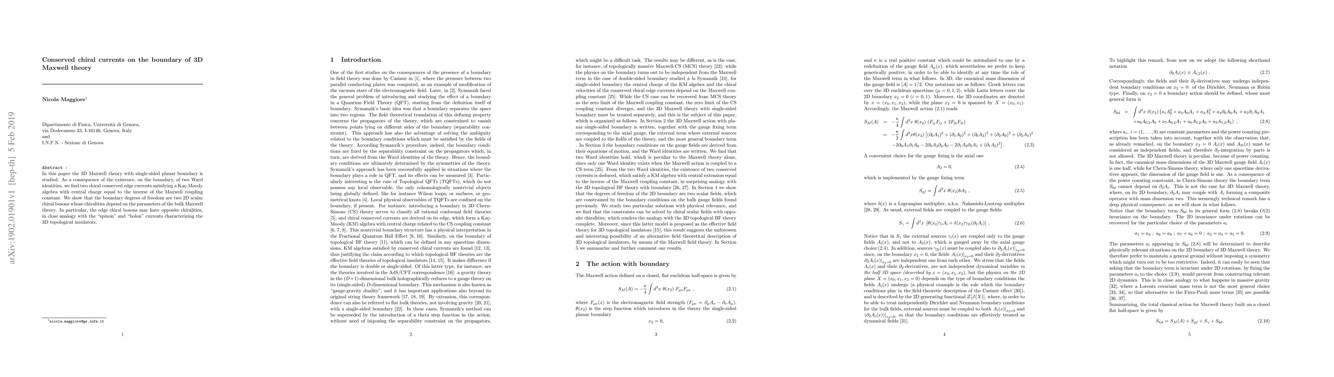 In this paper the 3D Maxwell theory with single-sided planar boundary is studied. As a consequence of the existence, on the boundary, of two Ward identities, we find two chiral conserved edge currents satisfying a Ka\c{c}-Moody algebra with central charge equal to the inverse of the Maxwell coupling constant. We show that the boundary degrees of freedom are two 2D scalar chiral bosons whose chiralities depend on the parameters of the bulk Maxwell theory. In particular, the edge chiral bosons may have opposite chiralities, in close analogy with the "spinon" and "holon" currents characterizing the 3D topological insulators.