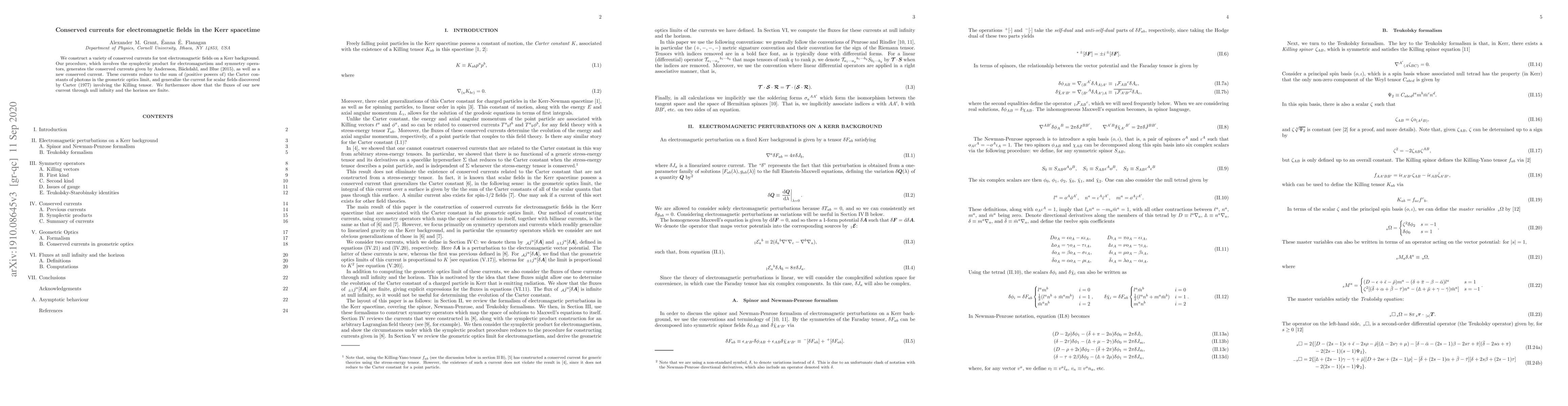 We construct a variety of conserved currents for test electromagnetic fields on a Kerr background. Our procedure, which involves the symplectic product for electromagnetism and symmetry operators, generates the conserved currents given by Andersson, B\"ackdahl, and Blue (2015), as well as a new conserved current. These currents reduce to the sum of (positive powers of) the Carter constants of photons in the geometric optics limit, and generalize the current for scalar fields discovered by Carter (1977) involving the Killing tensor. We furthermore show that the fluxes of our new current through null infinity and the horizon are finite.