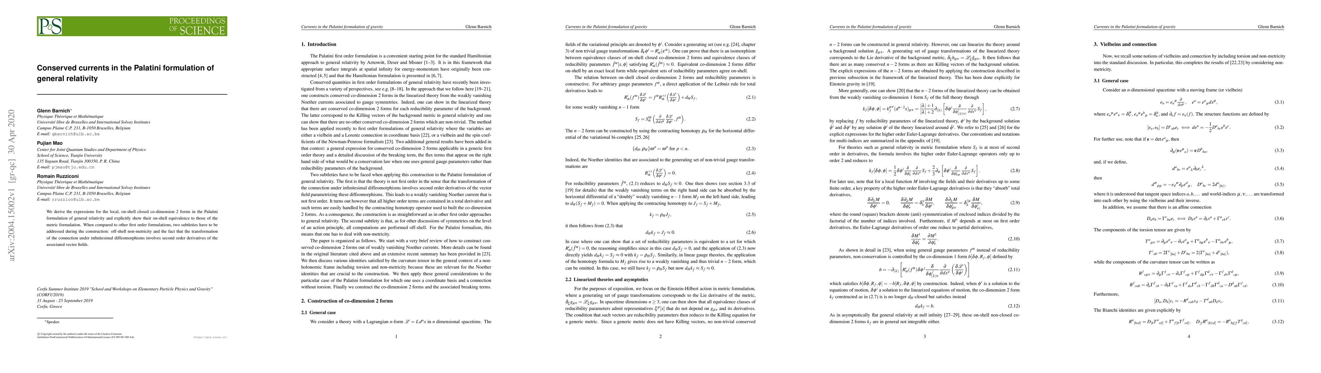 We derive the expressions for the local, on-shell closed co-dimension 2 forms in the Palatini formulation of general relativity and explicitly show their on-shell equivalence to those of the metric formulation. When compared to other first order formulations, two subtleties have to be addressed during the construction: off-shell non-metricity and the fact that the transformation of the connection under infinitesimal diffeomorphisms involves second order derivatives of the associated vector fields.