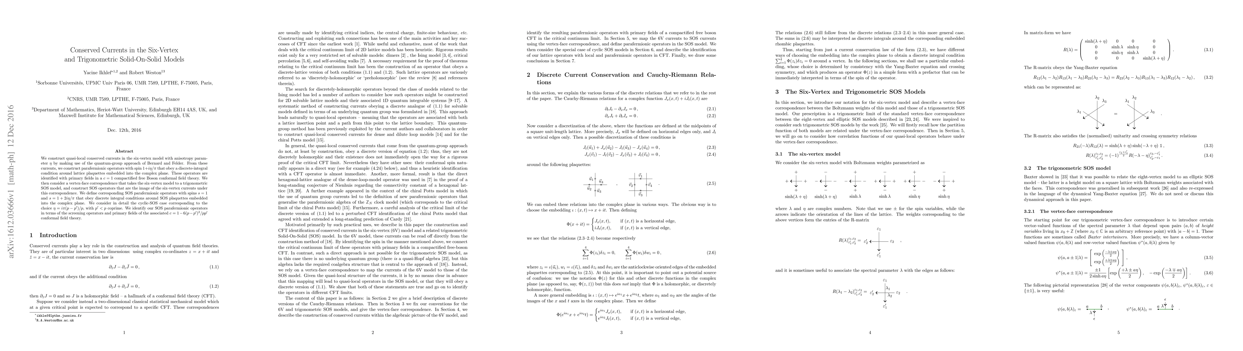 This paper constructs quasi-local conserved currents in the six-vertex model using a quantum-group approach, leading to parafermionic operators linked to a $c=1$ compactified free Boson conformal field theory. It extends these findings to the trigonometric solid-on-solid (SOS) model, defining corresponding SOS parafermionic operators and identifying them in terms of screening operators and primary fields of a related $c=1-6(p-p')^2/pp'$ conformal field theory.