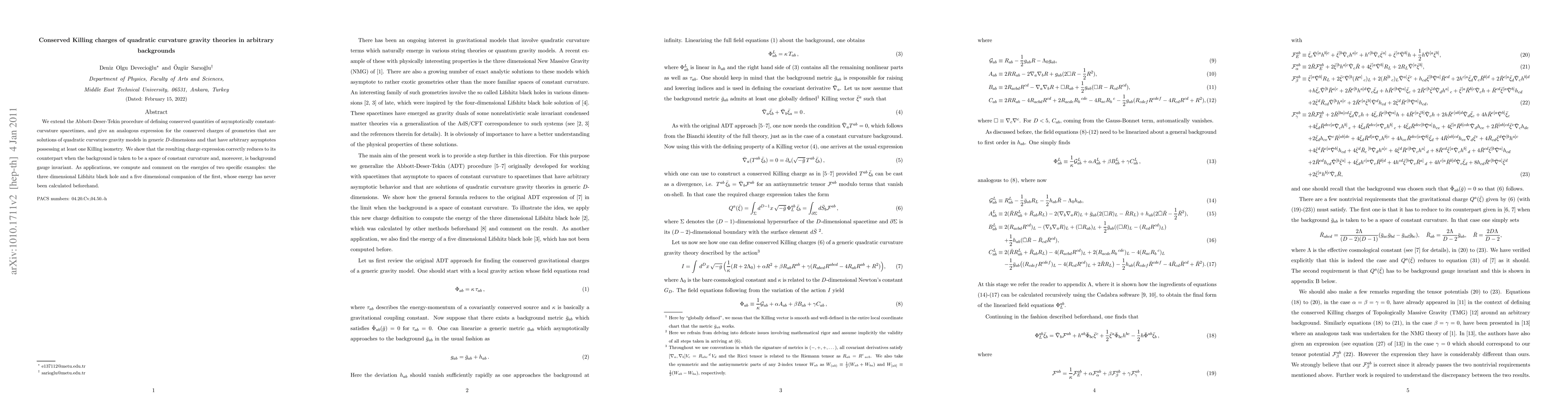 We extend the Abbott-Deser-Tekin procedure of defining conserved quantities of asymptotically constant-curvature spacetimes, and give an analogous expression for the conserved charges of geometries that are solutions of quadratic curvature gravity models in generic D-dimensions and that have arbitrary asymptotes possessing at least one Killing isometry. We show that the resulting charge expression correctly reduces to its counterpart when the background is taken to be a space of constant curvature and, moreover, is background gauge invariant. As applications, we compute and comment on the energies of two specific examples: the three dimensional Lifshitz black hole and a five dimensional companion of the first, whose energy has never been calculated beforehand.
