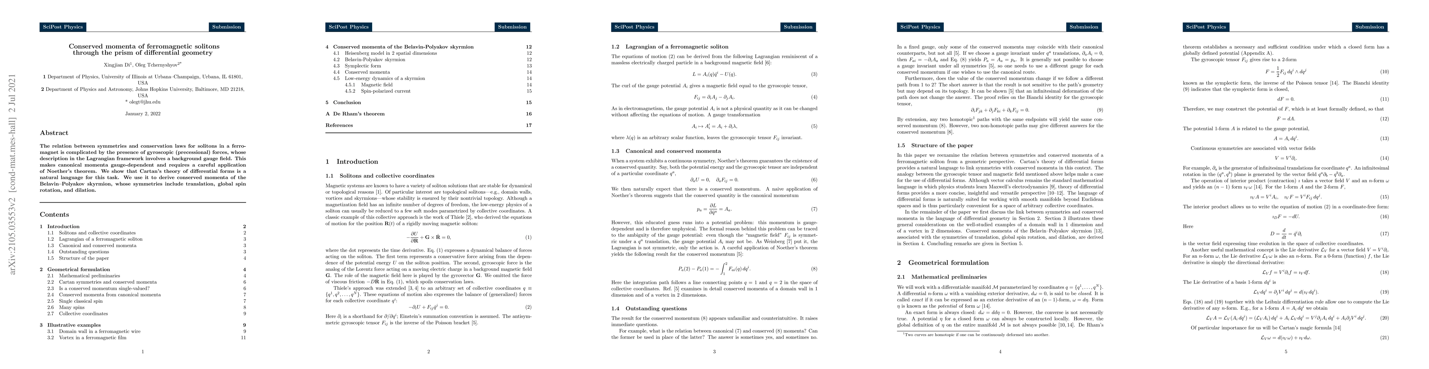 The relation between symmetries and conservation laws for solitons in a ferromagnet is complicated by the presence of gyroscopic (precessional) forces, whose description in the Lagrangian framework involves a background gauge field. This makes canonical momenta gauge-dependent and requires a careful application of Noether's theorem. We show that Cartan's theory of differential forms is a natural language for this task. We use it to derive conserved momenta of the Belavin--Polyakov skyrmion, whose symmetries include translation, global spin rotation, and dilation.