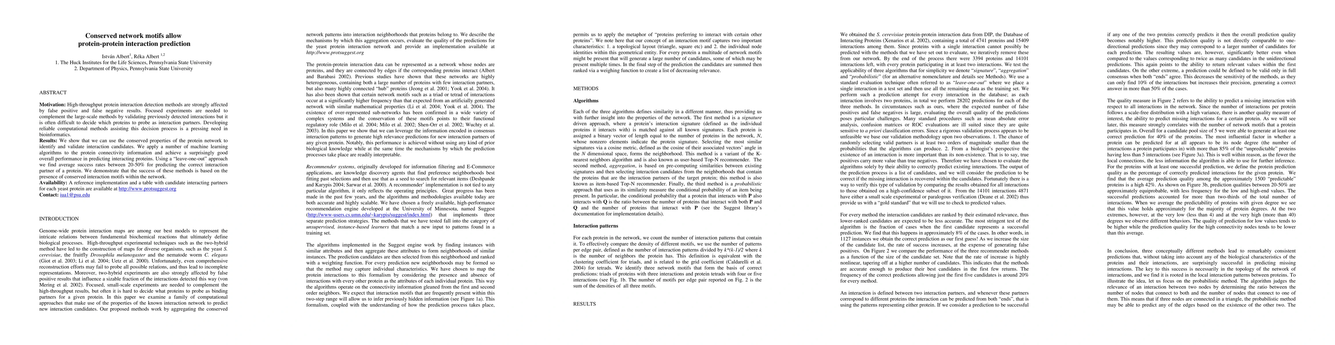 High-throughput protein interaction detection methods are strongly affected by false positive and false negative results. Focused experiments are needed to complement the large-scale methods by validating previously detected interactions but it is often difficult to decide which proteins to probe as interaction partners. Developing reliable computational methods assisting this decision process is a pressing need in bioinformatics. We show that we can use the conserved properties of the protein network to identify and validate interaction candidates. We apply a number of machine learning algorithms to the protein connectivity information and achieve a surprisingly good overall performance in predicting interacting proteins. Using a 'leave-one-out' approach we find average success rates between 20-50% for predicting the correct interaction partner of a protein. We demonstrate that the success of these methods is based on the presence of conserved interaction motifs within the network. A reference implementation and a table with candidate interacting partners for each yeast protein are available at http://www.protsuggest.org