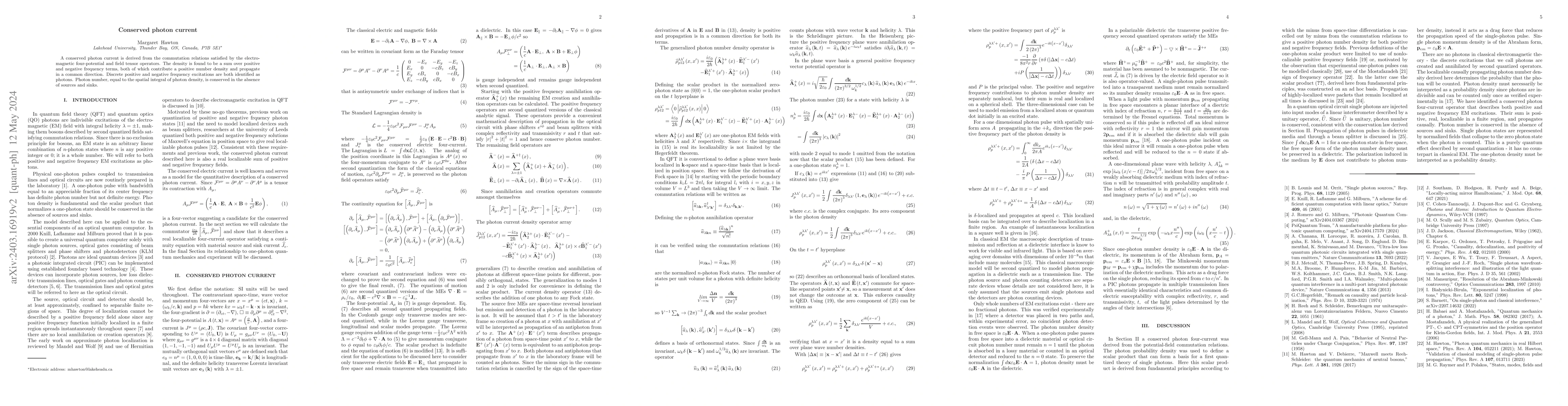 Summary: A conserved photon current is derived from electromagnetic field commutation relations, with both positive and negative frequency terms contributing equally to a conserved photon number in the absence of sources or sinks.