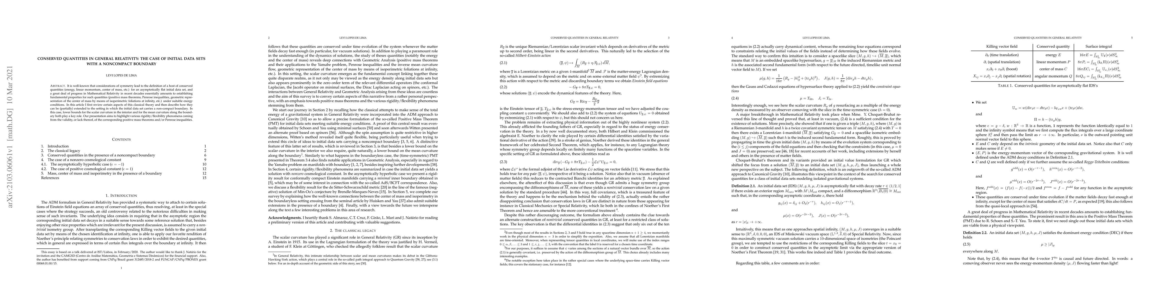 This paper reviews conserved quantities in General Relativity, focusing on asymptotically flat initial data sets, and extends these concepts to initial data sets with noncompact boundaries. It highlights the role of lower bounds for scalar and mean curvatures and discusses the implications of positive mass theorems and Penrose inequalities in these settings.
