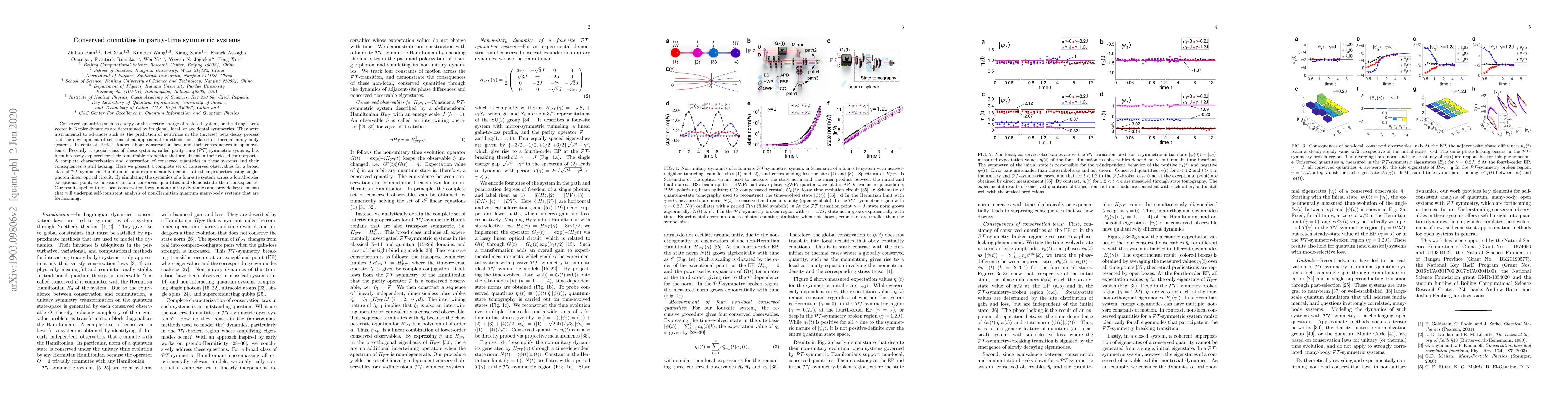 Conserved quantities such as energy or the electric charge of a closed system, or the Runge-Lenz vector in Kepler dynamics are determined by its global, local, or accidental symmetries. They were instrumental to advances such as the prediction of neutrinos in the (inverse) beta decay process and the development of self-consistent approximate methods for isolated or thermal many-body systems. In contrast, little is known about conservation laws and their consequences in open systems. Recently, a special class of these systems, called parity-time ($\mathcal{PT}$) symmetric systems, has been intensely explored for their remarkable properties that are absent in their closed counterparts. A complete characterization and observation of conserved quantities in these systems and their consequences is still lacking. Here we present a complete set of conserved observables for a broad class of $\mathcal{PT}$-symmetric Hamiltonians and experimentally demonstrate their properties using single-photon linear optical circuit. By simulating the dynamics of a four-site system across a fourth-order exceptional point, we measure its four conserved quantities and demonstrate their consequences. Our results spell out non-local conservation laws in non-unitary dynamics and provide key elements that will underpin self-consistent analysis of non-Hermitian quantum many-body systems that are forthcoming.