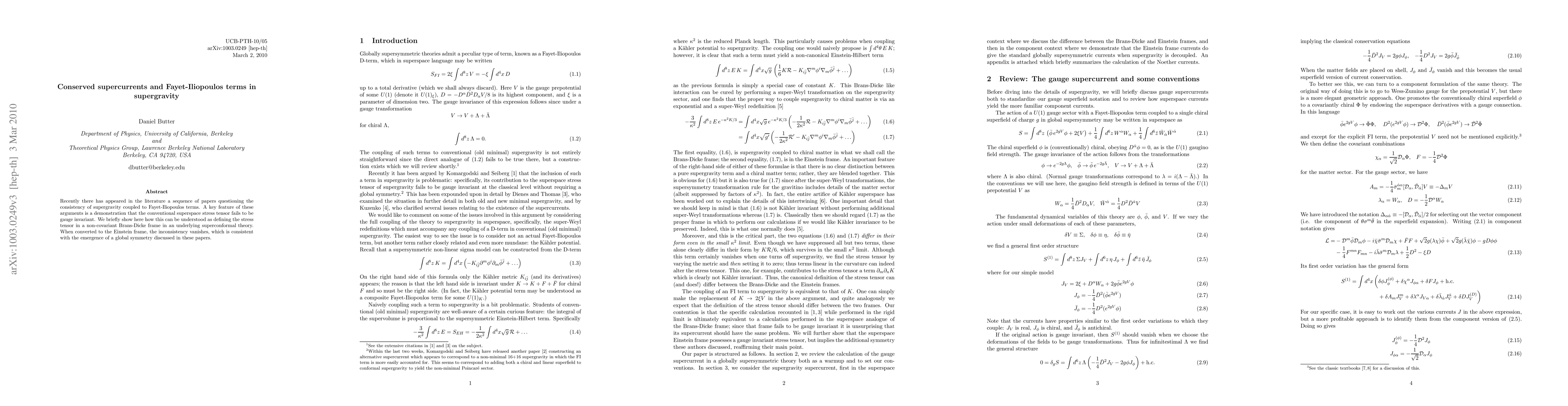 Recently there has appeared in the literature a sequence of papers questioning the consistency of supergravity coupled to Fayet-Iliopoulos terms. A key feature of these arguments is a demonstration that the conventional superspace stress tensor fails to be gauge invariant. We briefly show here how this can be understood as defining the stress tensor in a non-covariant Brans-Dicke frame in an underlying superconformal theory. When converted to the Einstein frame, the inconsistency vanishes, which is consistent with the emergence of a global symmetry discussed in these papers.