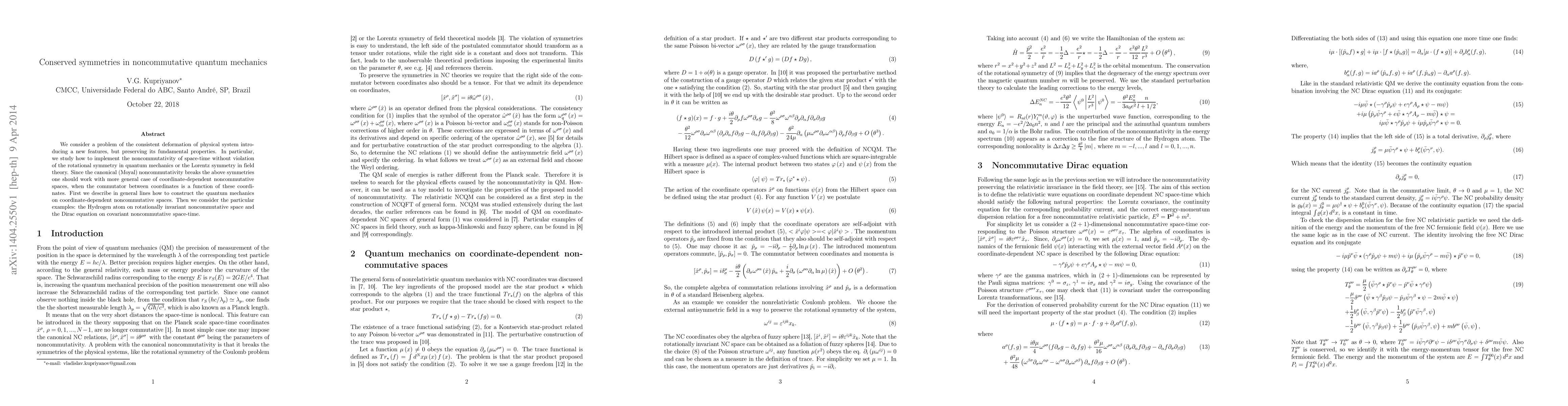 This paper explores how to implement noncommutativity in quantum mechanics and field theory while preserving rotational and Lorentz symmetries, constructing quantum mechanics on coordinate-dependent noncommutative spaces, and examining specific cases like the Hydrogen atom and the Dirac equation in such settings.