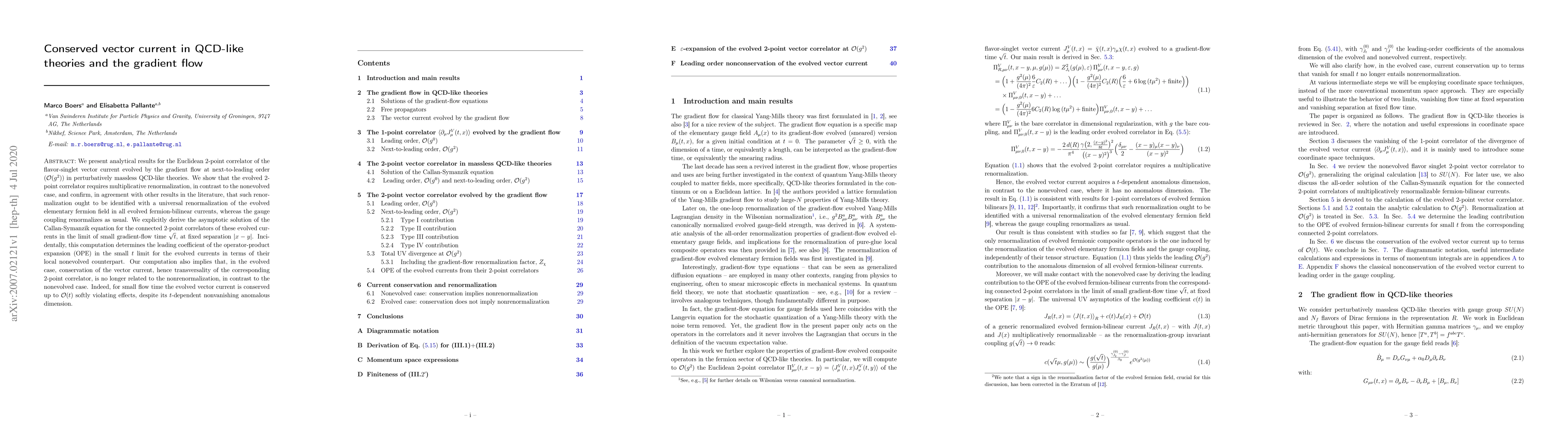 We present analytical results for the Euclidean 2-point correlator of the flavor-singlet vector current evolved by the gradient flow at next-to-leading order ($O(g^2)$) in perturbatively massless QCD-like theories. We show that the evolved 2-point correlator requires multiplicative renormalization, in contrast to the nonevolved case, and confirm, in agreement with other results in the literature, that such renormalization ought to be identified with a universal renormalization of the evolved elementary fermion field in all evolved fermion-bilinear currents, whereas the gauge coupling renormalizes as usual. We explicitly derive the asymptotic solution of the Callan-Symanzik equation for the connected 2-point correlators of these evolved currents in the limit of small gradient-flow time $\sqrt{t}$, at fixed separation $|x-y|$. Incidentally, this computation determines the leading coefficient of the operator-product expansion (OPE) in the small $t$ limit for the evolved currents in terms of their local nonevolved counterpart. Our computation also implies that, in the evolved case, conservation of the vector current, hence transversality of the corresponding 2-point correlator, is no longer related to the nonrenormalization, in contrast to the nonevolved case. Indeed, for small flow time the evolved vector current is conserved up to $O(t)$ softly violating effects, despite its $t$-dependent nonvanishing anomalous dimension.