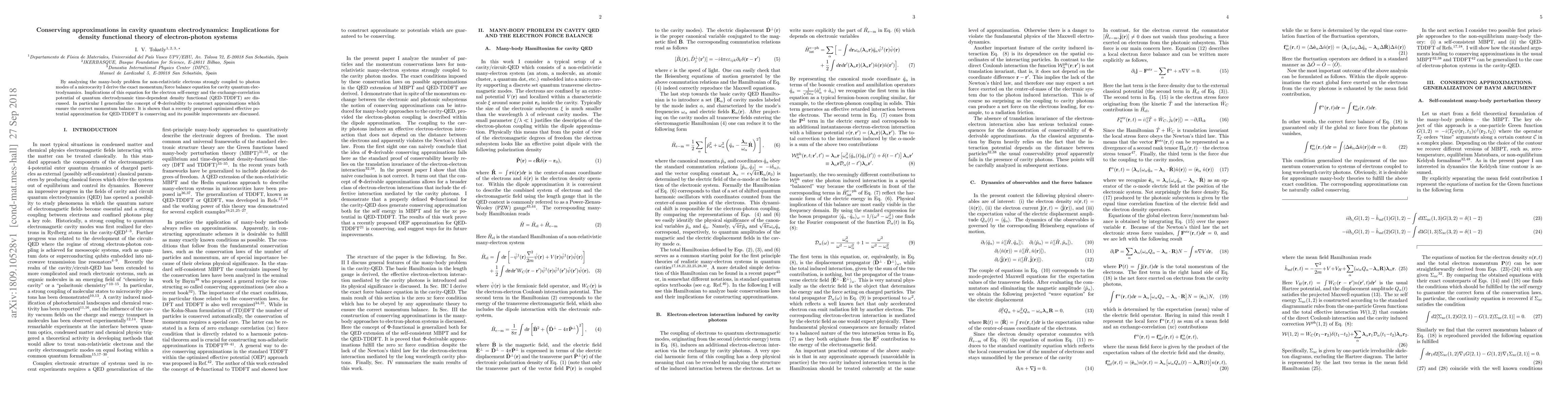The paper derives the exact momentum/force balance equation for cavity quantum electrodynamics and discusses its implications for the electron self-energy and exchange-correlation potential in QED-TDDFT. It introduces conserving approximations ensuring correct momentum balance and evaluates the optimized effective potential approximation for QED-TDDFT.
