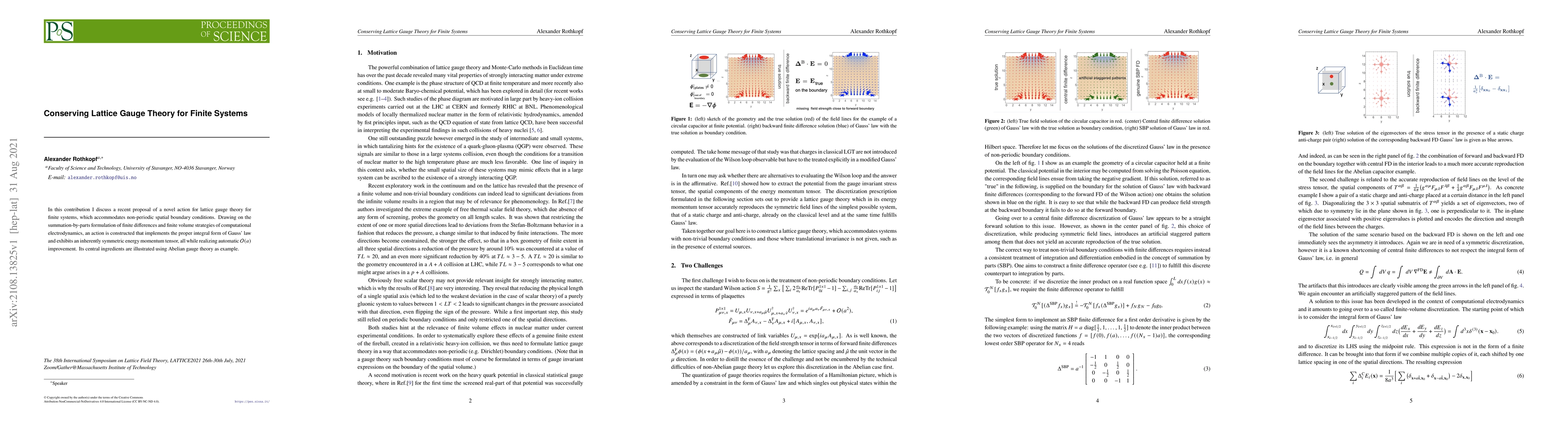 In this contribution I discuss a recent proposal of a novel action for lattice gauge theory for finite systems, which accommodates non-periodic spatial boundary conditions. Drawing on the summation-by-parts formulation of finite differences and finite volume strategies of computational electrodynamics, an action is constructed that implements the proper integral form of Gauss' law and exhibits an inherently symmetric energy momentum tensor, all while realizing automatic ${\cal O}(a)$ improvement. Its central ingredients are illustrated using Abelian gauge theory as example.
