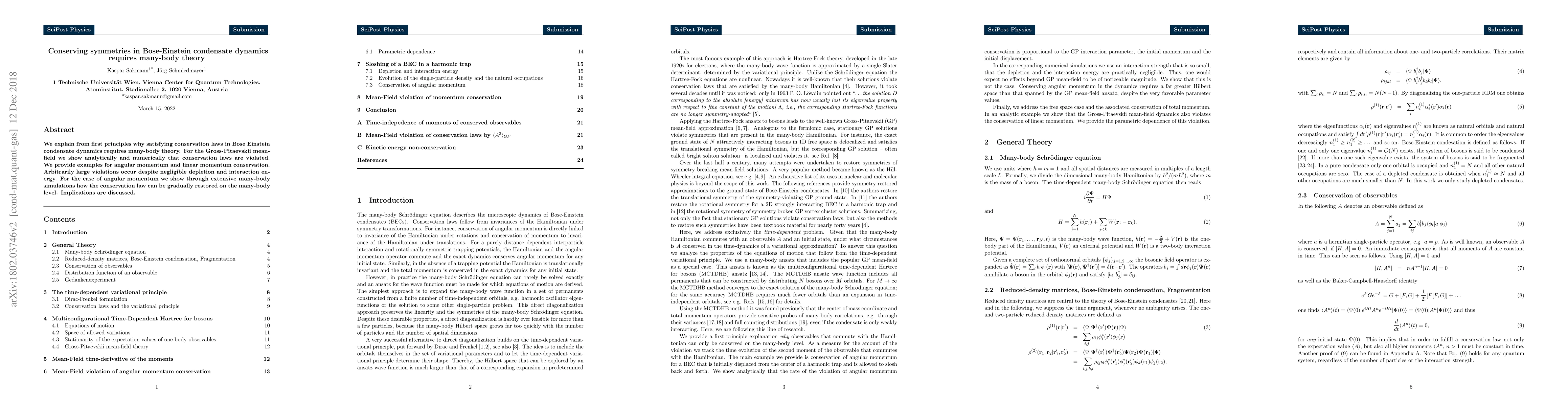 This paper demonstrates that conserving symmetries in Bose-Einstein condensate dynamics necessitates many-body theory, as the Gross-Pitaevskii mean-field approach violates conservation laws analytically and numerically, particularly for angular and linear momentum. Many-body simulations show how these laws can be restored at a higher theoretical level.