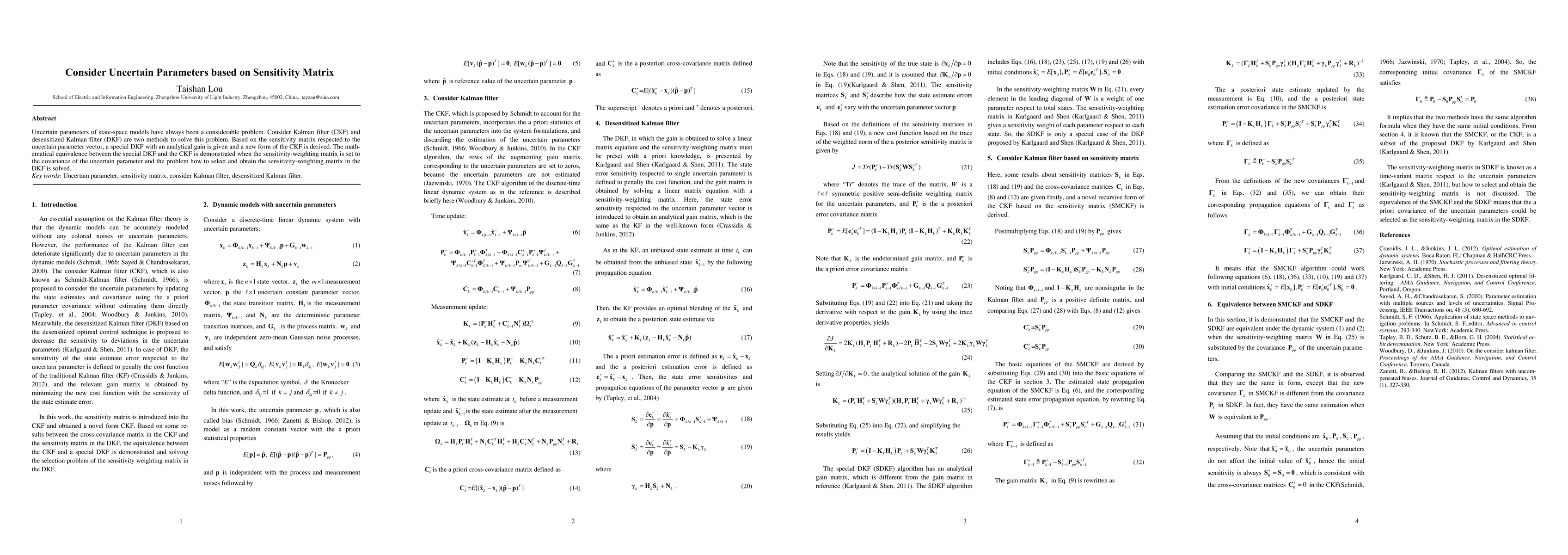 Uncertain parameters of state-space models have always been a considerable problem. Consider Kalman filter (CKF) and desensitized Kalman filter (DKF) are two methods to solve this problem. Based on the sensitivity matrix respected to the uncertain parameter vector, a special DKF with an analytical gain is given and a new form of the CKF is derived. The mathematical equivalence between the special DKF and the CKF is demonstrated when the sensitivity-weighting matrix is set to the covariance of the uncertain parameter and the problem how to select and obtain the sensitivity-weighting matrix in the DKF is solved.