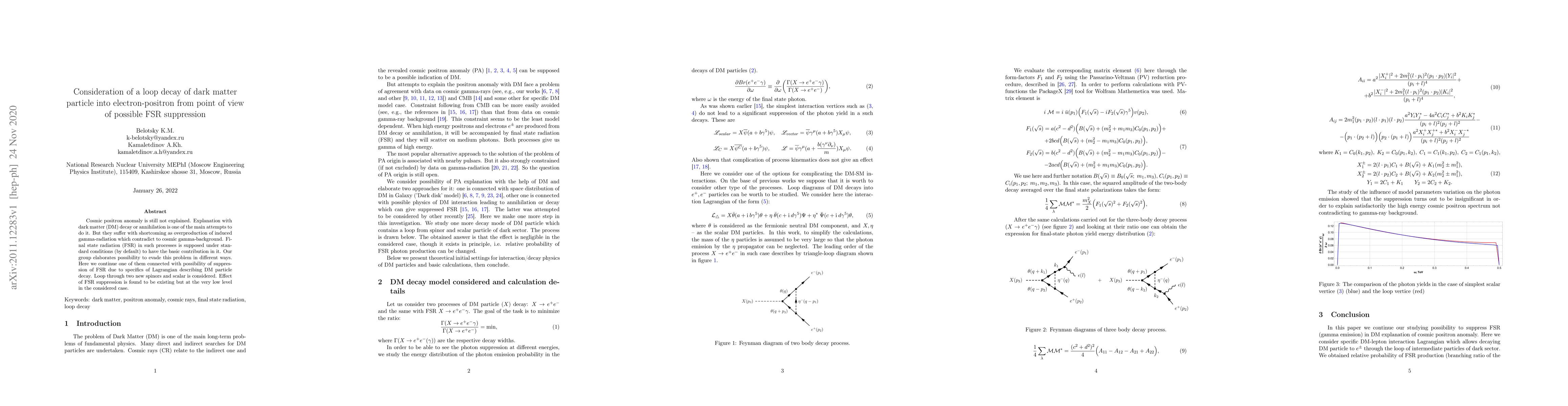 Cosmic positron anomaly is still not explained. Explanation with dark matter (DM) decay or annihilation is one of the main attempts to do it. But they suffer with shortcoming as overproduction of induced gamma-radiation which contradict to cosmic gamma-background. Final state radiation (FSR) in such processes is supposed under standard conditions (by default) to have the basic contribution in it. Our group elaborates possibility to evade this problem in different ways. Here we continue one of them connected with possibility of suppression of FSR due to specifics of Lagrangian describing DM particle decay. Loop through two new spinors and scalar is considered. Effect of FSR suppression is found to be existing but at the very low level in the considered case.