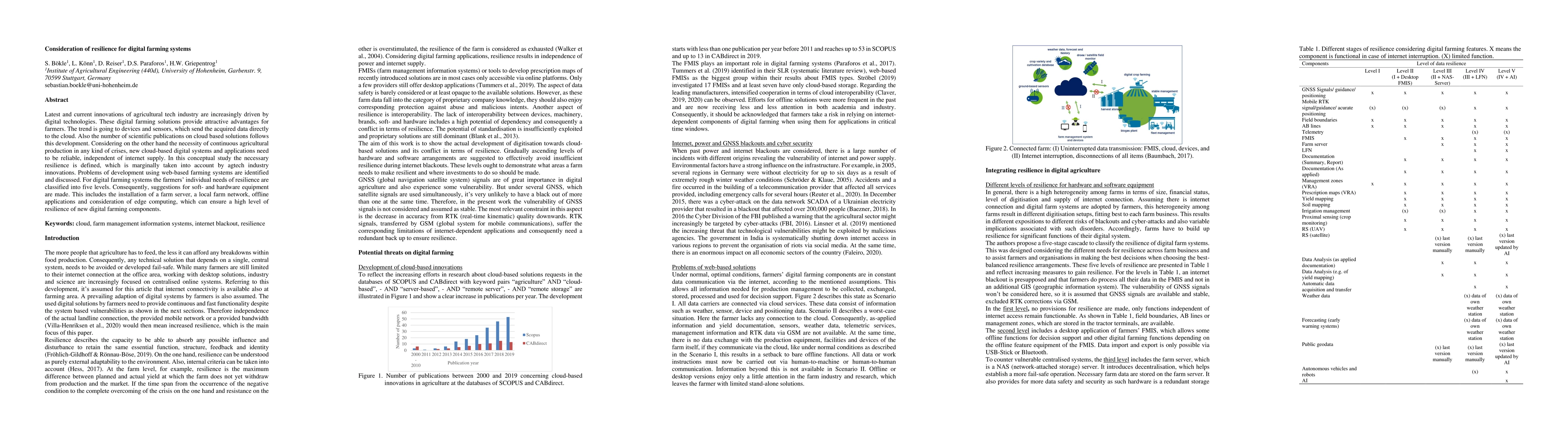 Latest and current innovations of agricultural tech industry are increasingly driven by digital technologies. These digital farming solutions provide attractive advantages for farmers. The trend is going to devices and sensors, which send the acquired data directly to the cloud. Also the number of scientific publications on cloud based solutions follows this development. Considering on the other hand the necessity of continuous agricultural production in any kind of crises, new cloud-based digital systems and applications need to be reliable, independent of internet supply. In this conceptual study the necessary resilience is defined, which is marginally taken into account by agtech industry innovations. Problems of development using web-based farming systems are identified and discussed. For digital farming systems the farmers individual needs of resilience are classified into five levels. Consequently, suggestions for soft- and hardware equipment are made. This includes the installation of a farm server, a local farm network, offline applications and consideration of edge computing, which can ensure a high level of resilience of new digital farming components.