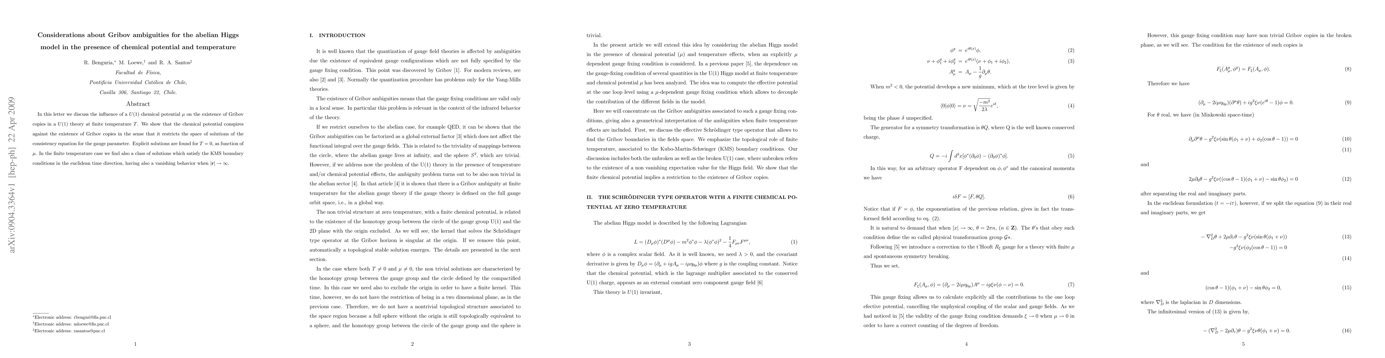 In this letter we discuss the influence of a U(1) chemical potential $\mu$ on the existence of Gribov copies in a U(1) theory at finite temperature $T$. We show that the chemical potential conspires against the existence of Gribov copies in the sense that it restricts the space of solutions of the consistency equation for the gauge parameter. Explicit solutions are found for T=0, as function of $\mu$. In the finite temperature case we find also a class of solutions which satisfy the KMS boundary conditions in the euclidean time direction, having also a vanishing behavior when $|\mathbf r|\to\infty$