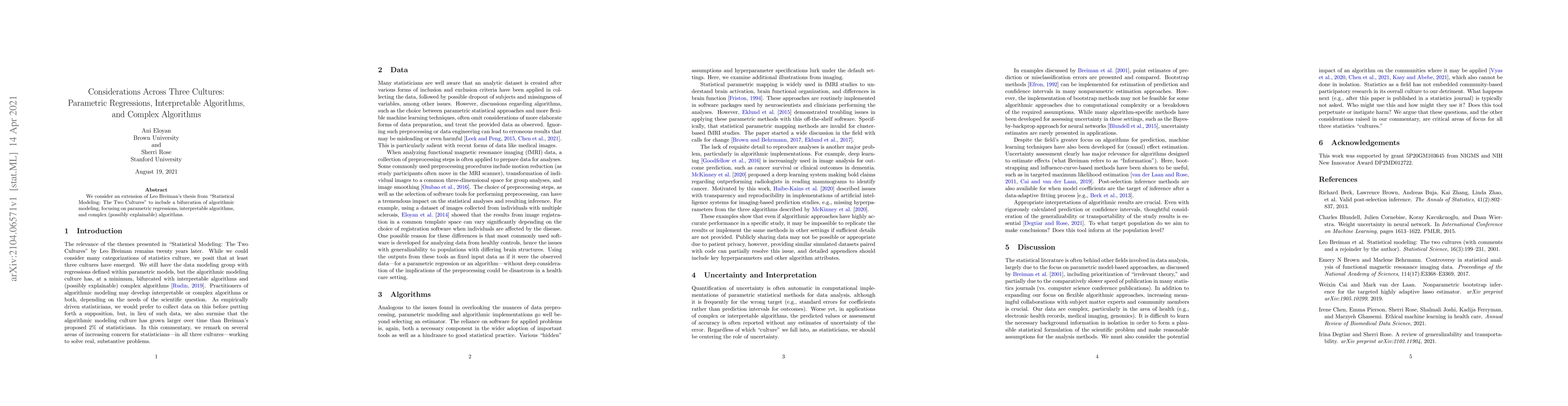 We consider an extension of Leo Breiman's thesis from "Statistical Modeling: The Two Cultures" to include a bifurcation of algorithmic modeling, focusing on parametric regressions, interpretable algorithms, and complex (possibly explainable) algorithms.
