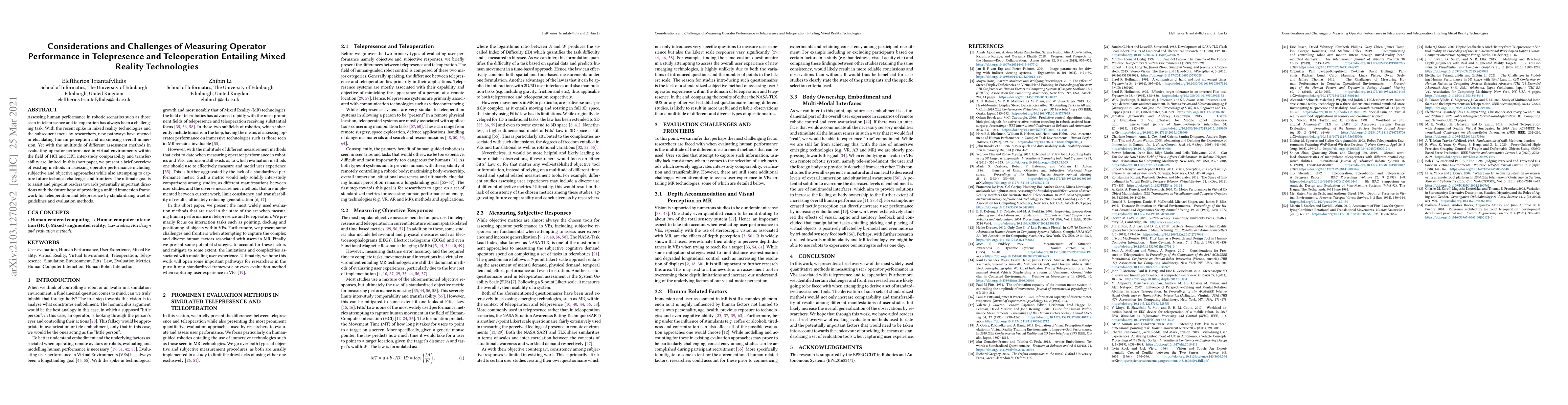Assessing human performance in robotic scenarios such as those seen in telepresence and teleoperation has always been a challenging task. With the recent spike in mixed reality technologies and the subsequent focus by researchers, new pathways have opened in elucidating human perception and maximising overall immersion. Yet with the multitude of different assessment methods in evaluating operator performance in virtual environments within the field of HCI and HRI, inter-study comparability and transferability are limited. In this short paper, we present a brief overview of existing methods in assessing operator performance including subjective and objective approaches while also attempting to capture future technical challenges and frontiers. The ultimate goal is to assist and pinpoint readers towards potentially important directions with the future hope of providing a unified immersion framework for teleoperation and telepresence by standardizing a set of guidelines and evaluation methods.