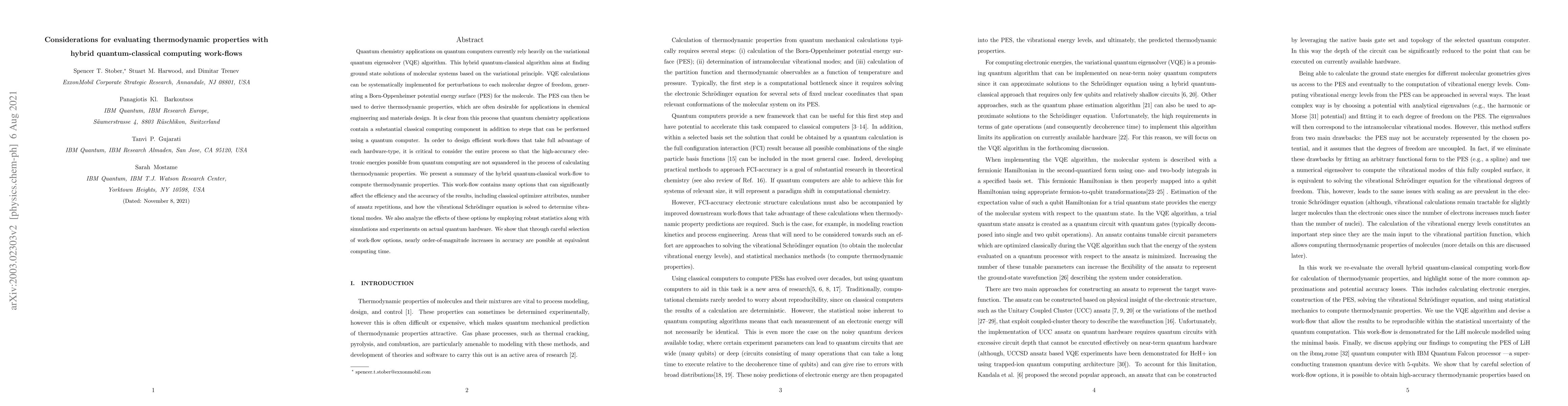 Quantum chemistry applications on quantum computers currently rely heavily on the variational quantum eigensolver (VQE) algorithm. This hybrid quantum-classical algorithm aims at finding ground state solutions of molecular systems based on the variational principle. VQE calculations can be systematically implemented for perturbations to each molecular degree of freedom, generating a Born-Oppenheimer potential energy surface (PES) for the molecule. The PES can then be used to derive thermodynamic properties, which are often desirable for applications in chemical engineering and materials design. It is clear from this process that quantum chemistry applications contain a substantial classical computing component in addition to steps that can be performed using a quantum computer. In order to design efficient work-flows that take full advantage of each hardware-type, it is critical to consider the entire process so that the high-accuracy electronic energies possible from quantum computing are not squandered in the process of calculating thermodynamic properties. We present a summary of the hybrid quantum-classical work-flow to compute thermodynamic properties. This work-flow contains many options that can significantly affect the efficiency and the accuracy of the results, including classical optimizer attributes, number of ansatz repetitions, and how the vibrational Schroedinger equation is solved to determine vibrational modes. We also analyze the effects of these options by employing robust statistics along with simulations and experiments on actual quantum hardware. We show that through careful selection of work-flow options, nearly order-of-magnitude increases in accuracy are possible at equivalent computing time.