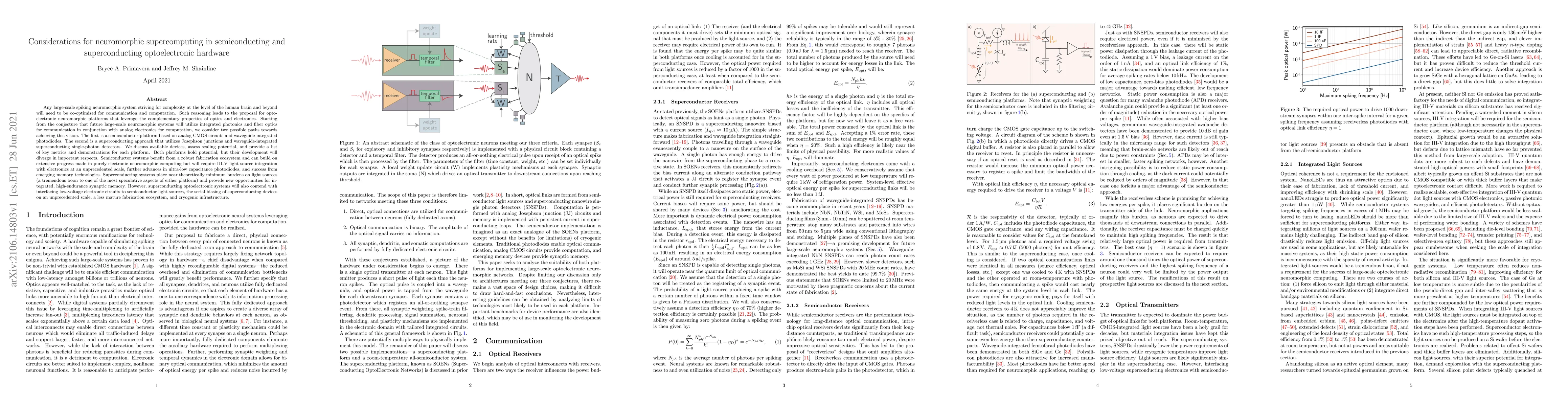 This paper explores two pathways for neuromorphic supercomputing: semiconductor and superconducting optoelectronic platforms. Semiconductor systems leverage CMOS circuits and photodiodes, benefiting from existing fabrication but requiring significant advancements in light source integration and low-capacitance photodiodes. Superconducting systems use Josephson junctions and superconducting single-photon detectors, offering minimal light source requirements and high-endurance synaptic memory but facing challenges in interfacing, biasing, and fabrication maturity.