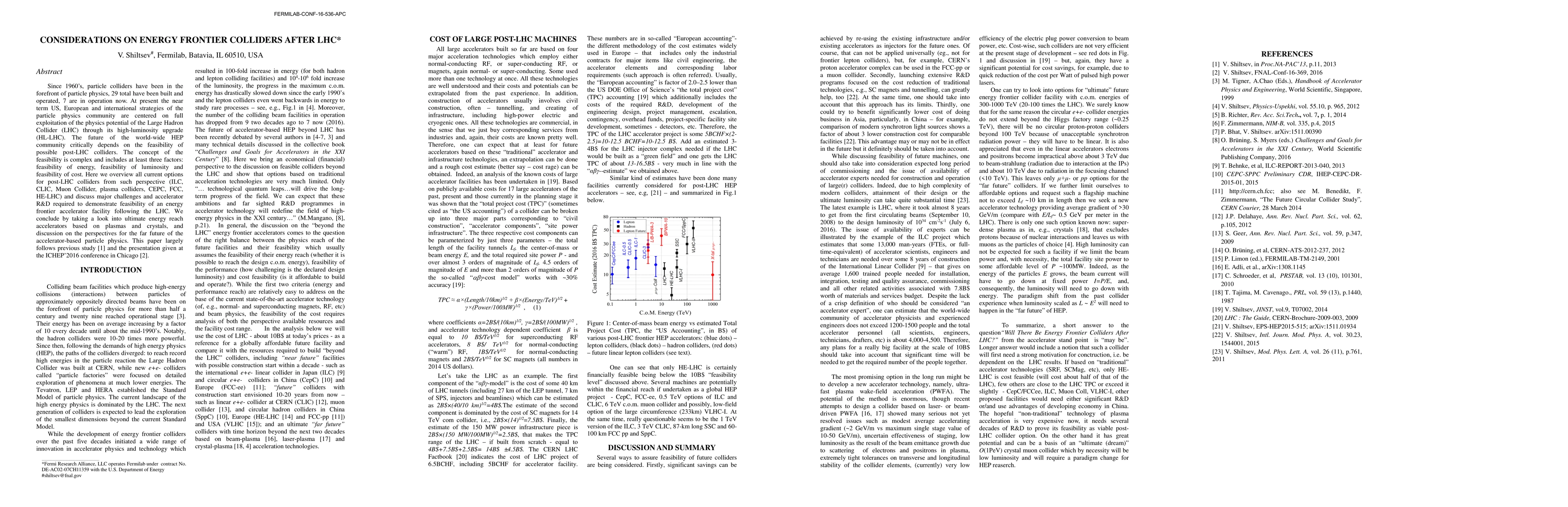 Since 1960's, particle colliders have been in the forefront of particle physics, 29 total have been built and operated, 7 are in operation now. At present the near term US, European and international strategies of the particle physics community are centered on full exploitation of the physics potential of the Large Hadron Collider (LHC) through its high-luminosity upgrade (HL-LHC). The future of the world-wide HEP community critically depends on the feasibility of possible post-LHC colliders. The concept of the feasibility is complex and includes at least three factors: feasibility of energy, feasibility of luminosity and feasibility of cost. Here we overview all current options for post-LHC colliders from such perspective (ILC, CLIC, Muon Collider, plasma colliders, CEPC, FCC, HE-LHC) and discuss major challenges and accelerator R&D required to demonstrate feasibility of an energy frontier accelerator facility following the LHC. We conclude by taking a look into ultimate energy reach accelerators based on plasmas and crystals, and discussion on the perspectives for the far future of the accelerator-based particle physics. This paper largely follows previous study and the presentation given at the ICHEP'2016 conference in Chicago.