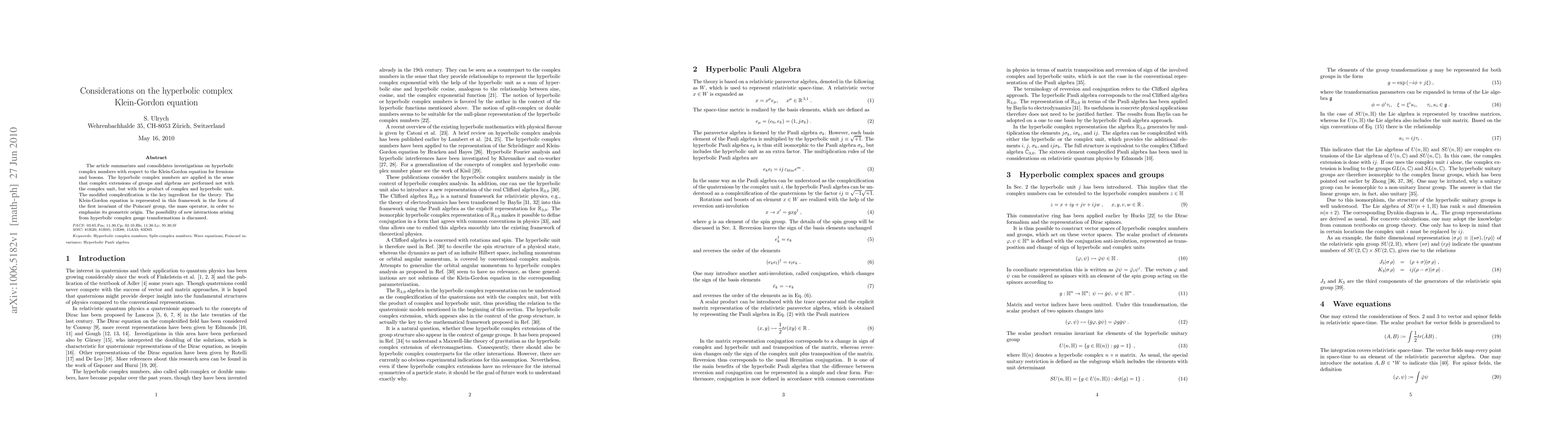 The article summarizes and consolidates investigations on hyperbolic complex numbers with respect to the Klein-Gordon equation for fermions and bosons. The hyperbolic complex numbers are applied in the sense that complex extensions of groups and algebras are performed not with the complex unit, but with the product of complex and hyperbolic unit. The modified complexification is the key ingredient for the theory. The Klein-Gordon equation is represented in this framework in the form of the first invariant of the Poincar\'e group, the mass operator, in order to emphasize its geometric origin. The possibility of new interactions arising from hyperbolic complex gauge transformations is discussed.