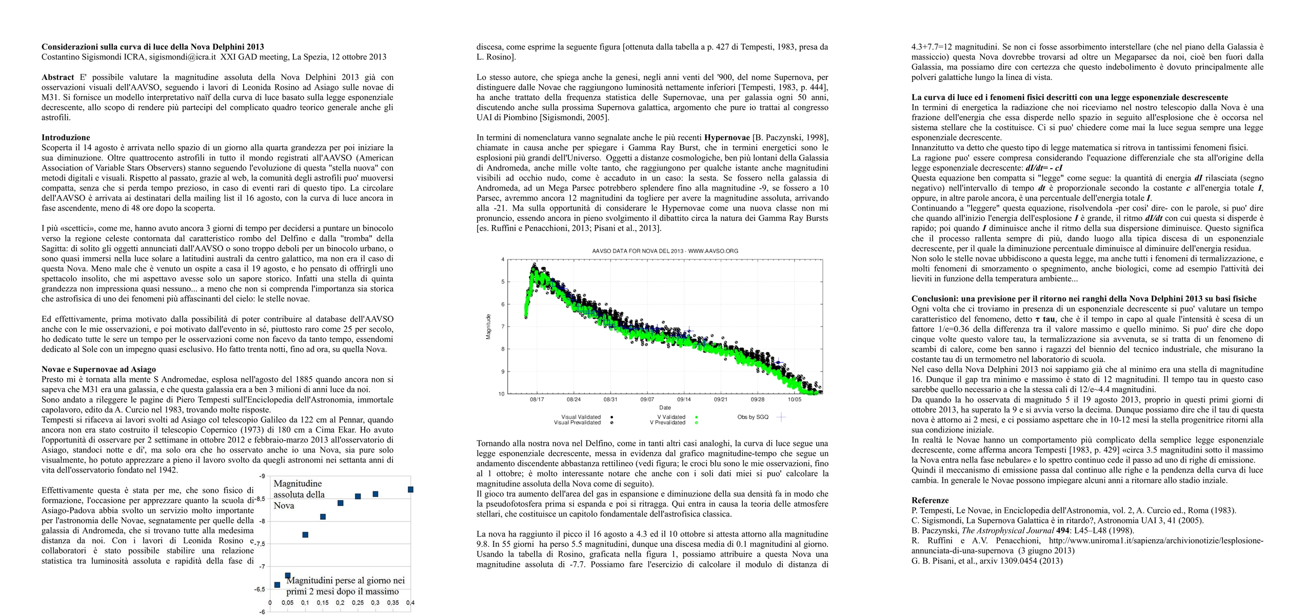 It is possible to evaluate the absolute magnitude of the Nova Delphini 2013 with visual observations submitted to AAVSO, following the works of Leonida Rosino at Asiago Observatory on the novae of M31. A naif interpretative model of the light curve is presented, based on the decreasing exponential law, in order to open to amateur astronomers a glimpse on the complex theoretical framework of these phenomena.