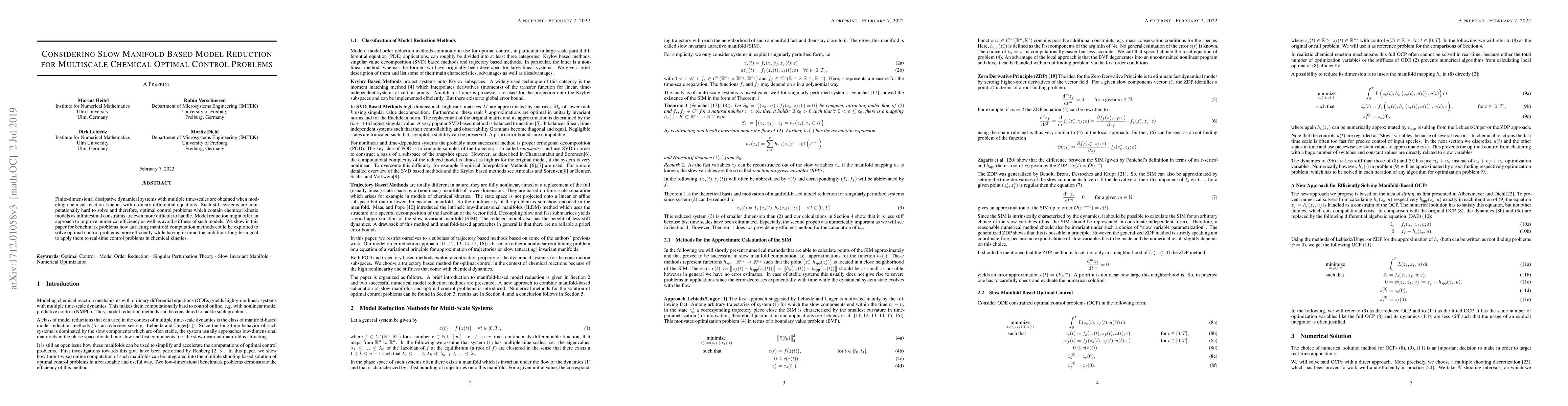 Finite-dimensional dissipative dynamical systems with multiple time-scales are obtained when modeling chemical reaction kinetics with ordinary differential equations. Such stiff systems are computationally hard to solve and therefore, optimal control problems which contain ordinary differential equations as infinitesimal constraints are even more difficult to handle. Model reduction might offer an approach to improve numerical efficiency as well as avoiding stiffness of such models. We show in this paper in benchmark fashion how attracting manifold computation methods could be exploited to solve optimal control more efficiently while having in mind the ambitious long-term goal to apply them to real-time control problems in chemical kinetics.