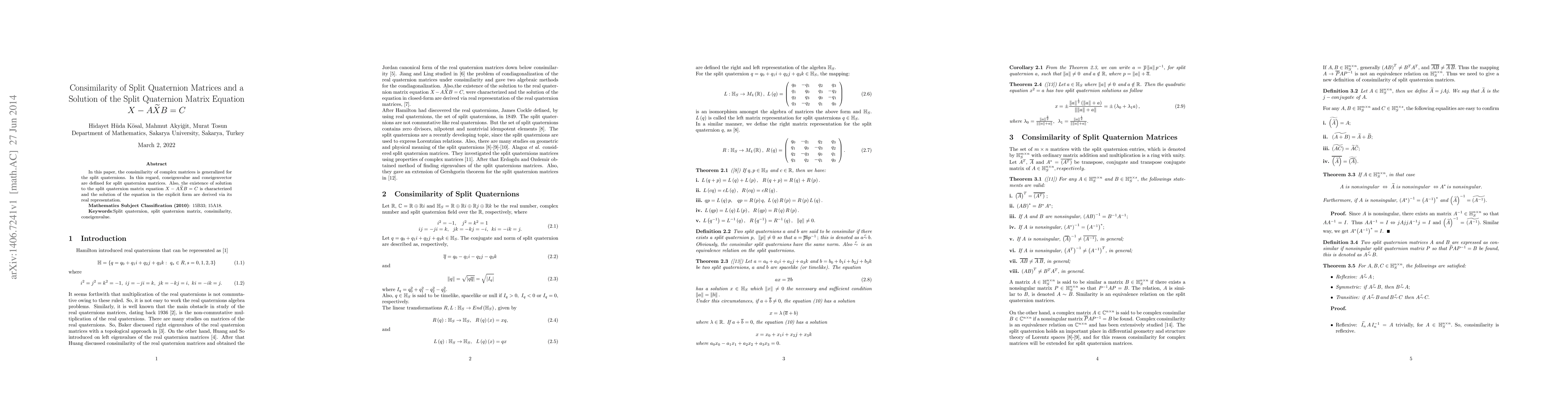 This paper generalizes the concept of consimilarity from complex matrices to split quaternion matrices, defining coneigenvalues and coneigenvectors. It also characterizes the solution existence for the split quaternion matrix equation X - AXB = C and derives its explicit solution through its real representation.