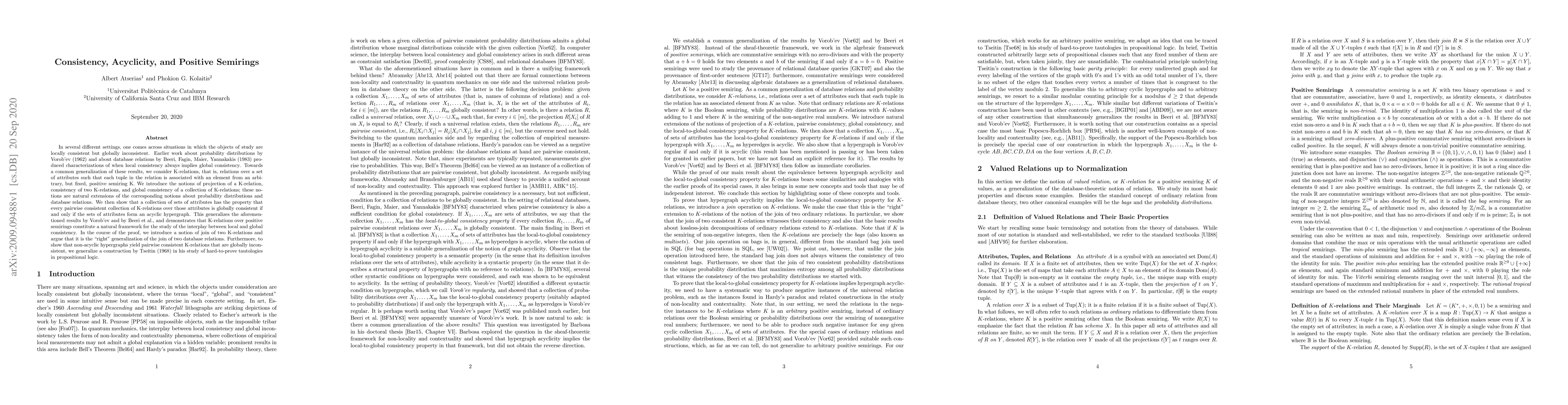 In several different settings, one comes across situations in which the objects of study are locally consistent but globally inconsistent. Earlier work about probability distributions by Vorob'ev (1962) and about database relations by Beeri, Fagin, Maier, Yannakakis (1983) produced characterizations of when local consistency always implies global consistency. Towards a common generalization of these results, we consider K-relations, that is, relations over a set of attributes such that each tuple in the relation is associated with an element from an arbitrary, but fixed, positive semiring K. We introduce the notions of projection of a K-relation, consistency of two K-relations, and global consistency of a collection of K-relations; these notions are natural extensions of the corresponding notions about probability distributions and database relations. We then show that a collection of sets of attributes has the property that every pairwise consistent collection of K-relations over those attributes is globally consistent if and only if the sets of attributes form an acyclic hypergraph. This generalizes the aforementioned results by Vorob'ev and by Beeri et al., and demonstrates that K-relations over positive semirings constitute a natural framework for the study of the interplay between local and global consistency. In the course of the proof, we introduce a notion of join of two K-relations and argue that it is the "right" generalization of the join of two database relations. Furthermore, to show that non-acyclic hypergraphs yield pairwise consistent K-relations that are globally inconsistent, we generalize a construction by Tseitin (1968) in his study of hard-to-prove tautologies in propositional logic.