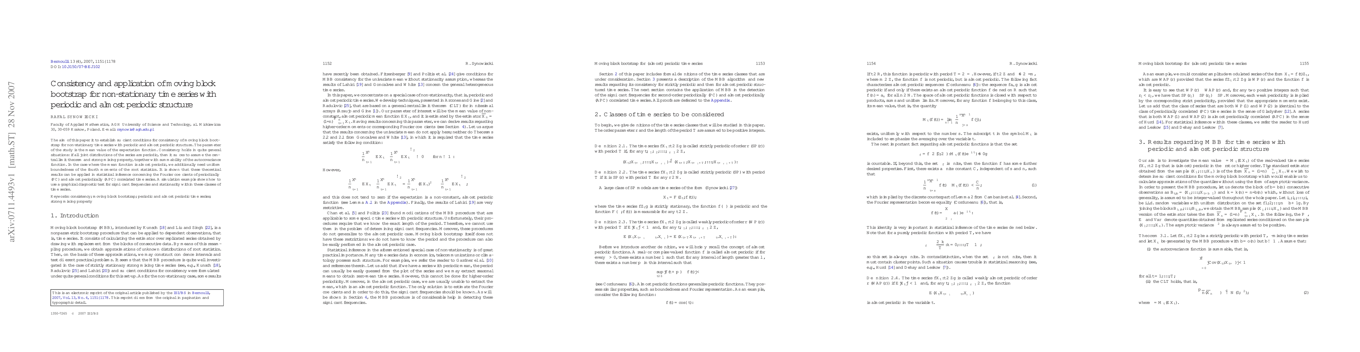 The aim of this paper it to establish sufficient conditions for consistency of moving block bootstrap for non-stationary time series with periodic and almost periodic structure. The parameter of the study is the mean value of the expectation function. Consistency holds in quite general situations: if all joint distributions of the series are periodic, then it suffices to assume the central limit theorem and strong mixing property, together with summability of the autocovariance function. In the case where the mean function is almost periodic, we additionally need uniform boundedness of the fourth moments of the root statistics. It is shown that these theoretical results can be applied in statistical inference concerning the Fourier coefficients of periodically (PC) and almost periodically (APC) correlated time series. A simulation example shows how to use a graphical diagnostic test for significant frequencies and stationarity within these classes of time series.