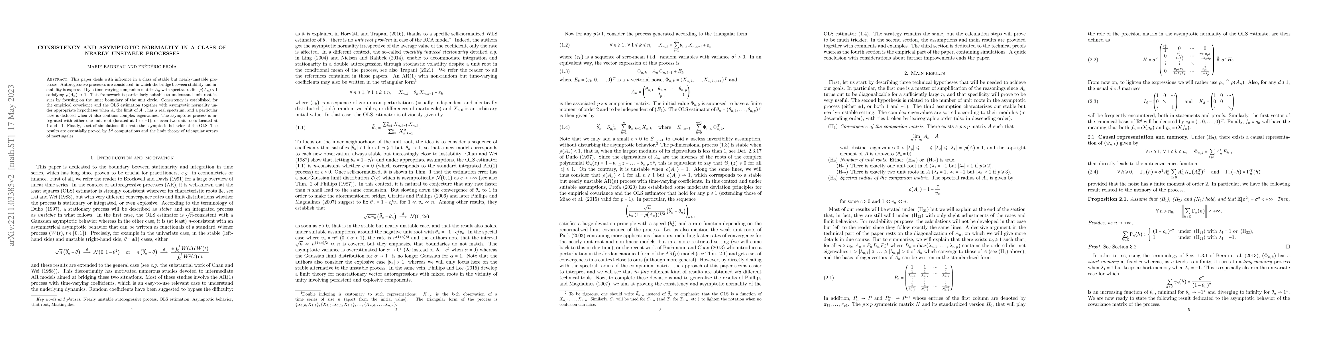 This paper deals with inference in a class of stable but nearly-unstable processes. Autoregressive processes are considered, in which the bridge between stability and instability is expressed by a time-varying companion matrix $A_{n}$ with spectral radius $\rho(A_{n}) < 1$ satisfying $\rho(A_{n}) \rightarrow 1$. This framework is particularly suitable to understand unit root issues by focusing on the inner boundary of the unit circle. Consistency is established for the empirical covariance and the OLS estimation together with asymptotic normality under appropriate hypotheses when $A$, the limit of $A_n$, has a real spectrum, and a particular case is deduced when $A$ also contains complex eigenvalues. The asymptotic process is integrated with either one unit root (located at 1 or $-1$), or even two unit roots located at 1 and $-1$. Finally, a set of simulations illustrate the asymptotic behavior of the OLS. The results are essentially proved by $L^2$ computations and the limit theory of triangular arrays of martingales.