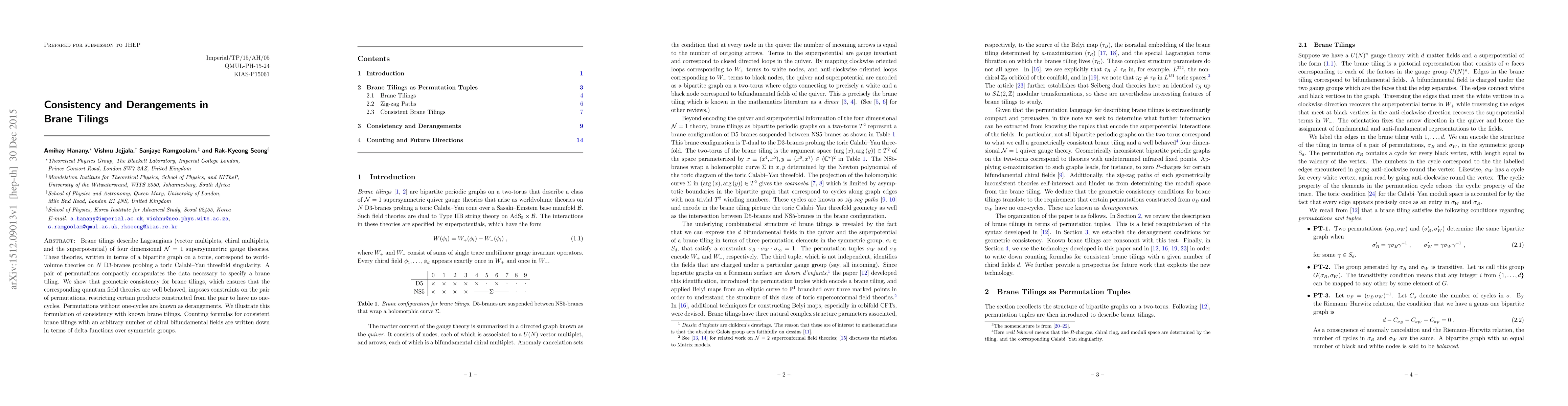 Brane tilings describe Lagrangians (vector multiplets, chiral multiplets, and the superpotential) of four dimensional $\mathcal{N}=1$ supersymmetric gauge theories. These theories, written in terms of a bipartite graph on a torus, correspond to worldvolume theories on $N$ D$3$-branes probing a toric Calabi-Yau threefold singularity. A pair of permutations compactly encapsulates the data necessary to specify a brane tiling. We show that geometric consistency for brane tilings, which ensures that the corresponding quantum field theories are well behaved, imposes constraints on the pair of permutations, restricting certain products constructed from the pair to have no one-cycles. Permutations without one-cycles are known as derangements. We illustrate this formulation of consistency with known brane tilings. Counting formulas for consistent brane tilings with an arbitrary number of chiral bifundamental fields are written down in terms of delta functions over symmetric groups.