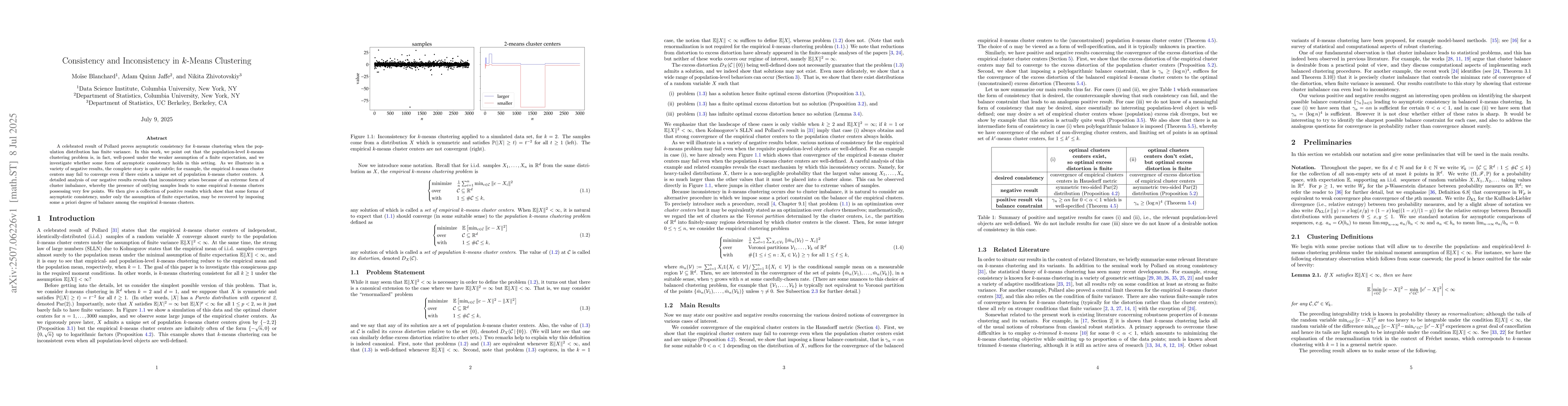 A celebrated result of Pollard proves asymptotic consistency for $k$-means clustering when the population distribution has finite variance. In this work, we point out that the population-level $k$-means clustering problem is, in fact, well-posed under the weaker assumption of a finite expectation, and we investigate whether some form of asymptotic consistency holds in this setting. As we illustrate in a variety of negative results, the complete story is quite subtle; for example, the empirical $k$-means cluster centers may fail to converge even if there exists a unique set of population $k$-means cluster centers. A detailed analysis of our negative results reveals that inconsistency arises because of an extreme form of cluster imbalance, whereby the presence of outlying samples leads to some empirical $k$-means clusters possessing very few points. We then give a collection of positive results which show that some forms of asymptotic consistency, under only the assumption of finite expectation, may be recovered by imposing some a priori degree of balance among the empirical $k$-means clusters.