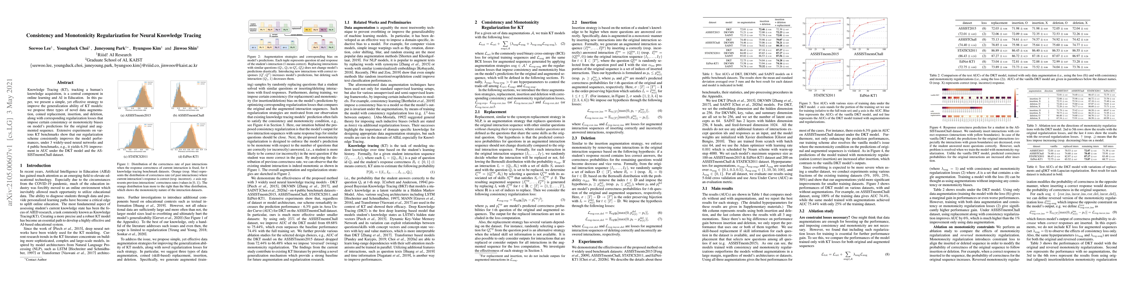 This paper proposes novel data augmentation techniques—replacement, insertion, and deletion—alongside regularization losses to enhance the generalization of neural knowledge tracing models. The regularization scheme consistently improves model performance across different neural networks and benchmarks, achieving a 6.3% AUC improvement under the DKT model on the ASSISTmentsChall dataset.