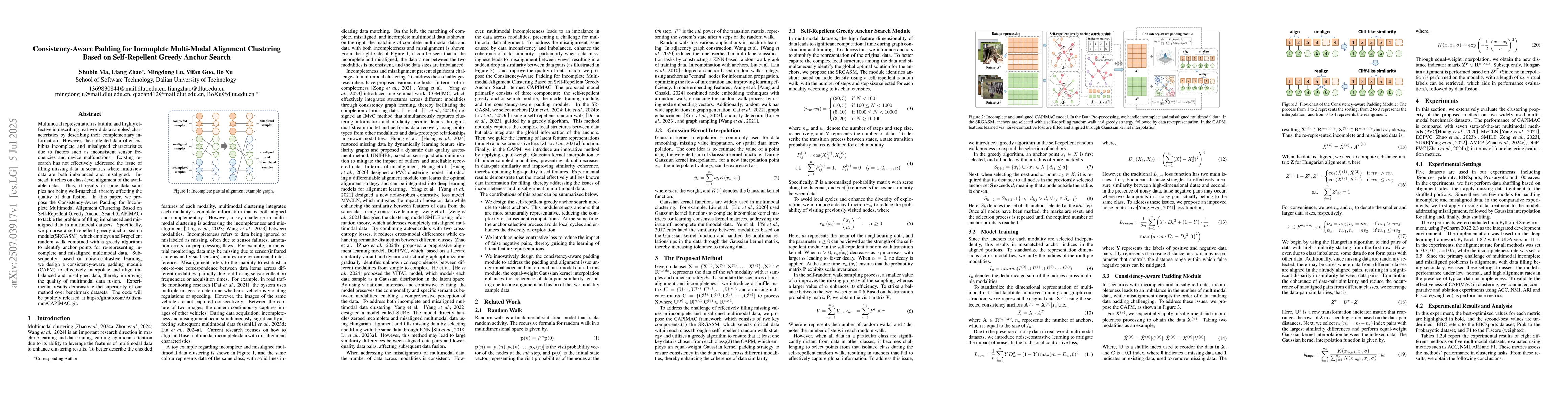 Multimodal representation is faithful and highly effective in describing real-world data samples' characteristics by describing their complementary information. However, the collected data often exhibits incomplete and misaligned characteristics due to factors such as inconsistent sensor frequencies and device malfunctions. Existing research has not effectively addressed the issue of filling missing data in scenarios where multiview data are both imbalanced and misaligned. Instead, it relies on class-level alignment of the available data. Thus, it results in some data samples not being well-matched, thereby affecting the quality of data fusion. In this paper, we propose the Consistency-Aware Padding for Incomplete Multimodal Alignment Clustering Based on Self-Repellent Greedy Anchor Search(CAPIMAC) to tackle the problem of filling imbalanced and misaligned data in multimodal datasets. Specifically, we propose a self-repellent greedy anchor search module(SRGASM), which employs a self-repellent random walk combined with a greedy algorithm to identify anchor points for re-representing incomplete and misaligned multimodal data. Subsequently, based on noise-contrastive learning, we design a consistency-aware padding module (CAPM) to effectively interpolate and align imbalanced and misaligned data, thereby improving the quality of multimodal data fusion. Experimental results demonstrate the superiority of our method over benchmark datasets. The code will be publicly released at https://github.com/Autism-mm/CAPIMAC.git.