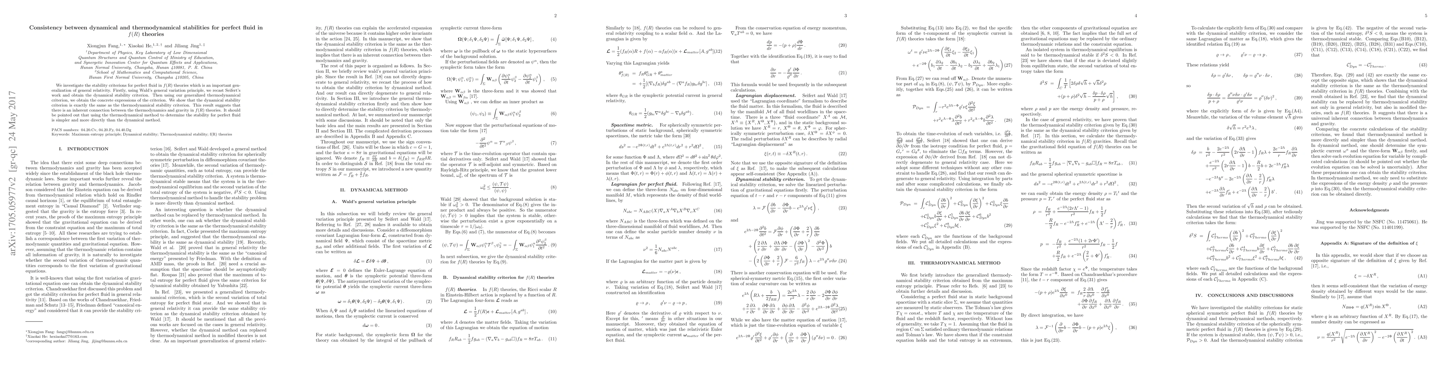This paper investigates the stability criteria for perfect fluid in $f(R)$ theories, demonstrating that the dynamical and thermodynamical stability criteria are identical. This finding reveals a fundamental link between thermodynamics and gravity within these theories, with the thermodynamical method proving simpler for stability determination.