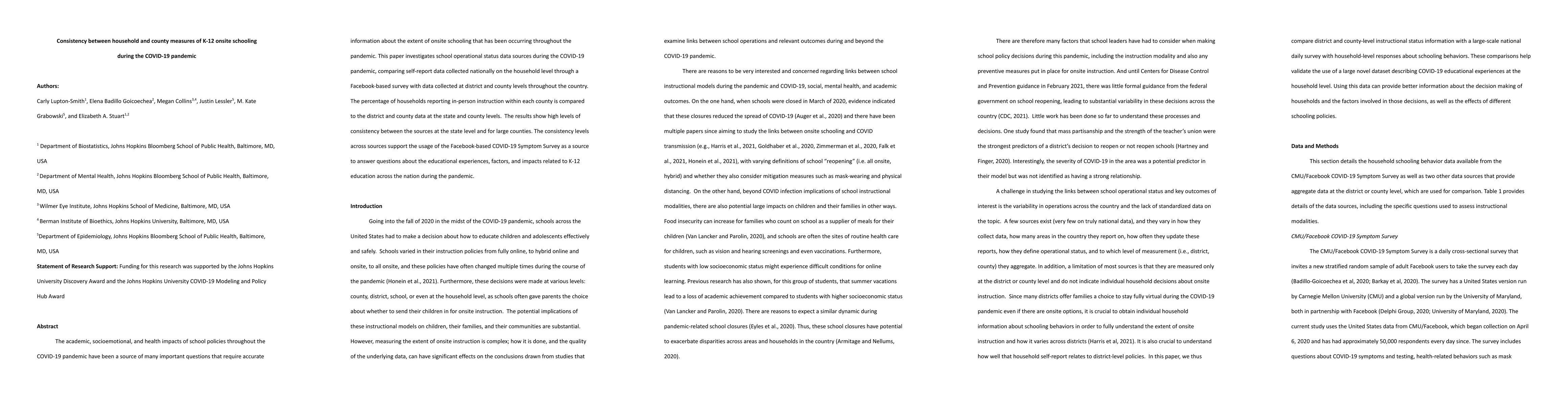 This paper compares household and county-level data on K-12 onsite schooling during the COVID-19 pandemic, finding high consistency between the Facebook-based survey and official district/county data, especially at state and large county levels. The study supports using the survey for understanding educational impacts during the pandemic.