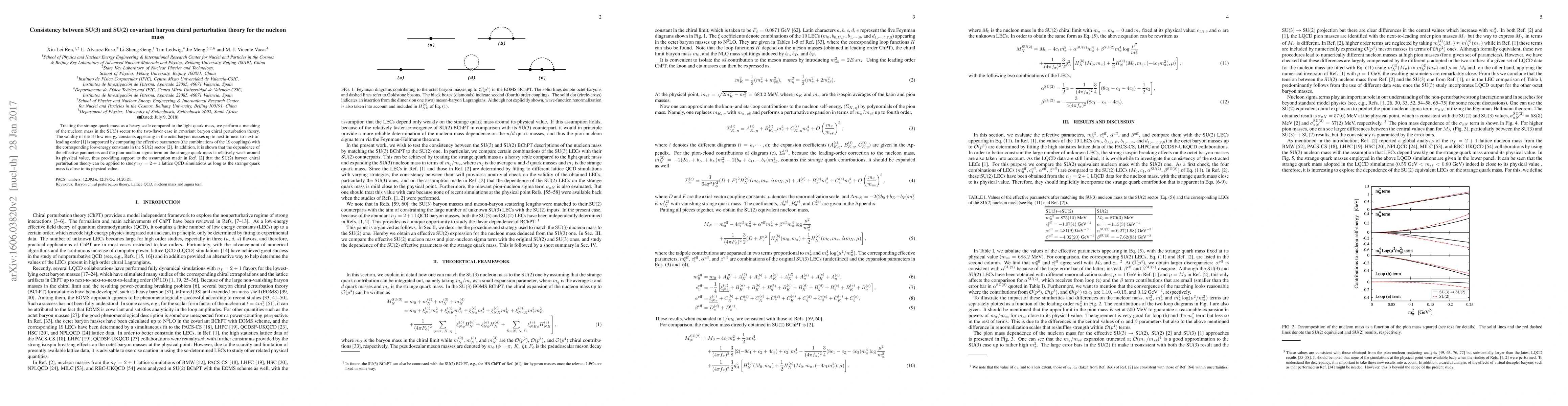 Treating the strange quark mass as a heavy scale compared to the light quark mass, we perform a matching of the nucleon mass in the SU(3) sector to the two-flavor case in covariant baryon chiral perturbation theory. The validity of the $19$ low-energy constants appearing in the octet baryon masses up to next-to-next-to-next-to-leading order~\cite{Ren:2014vea} is supported by comparing the effective parameters (the combinations of the $19$ couplings) with the corresponding low-energy constants in the SU(2) sector~\cite{Alvarez-Ruso:2013fza}. In addition, it is shown that the dependence of the effective parameters and the pion-nucleon sigma term on the strange quark mass is relatively weak around its physical value, thus providing support to the assumption made in Ref.~\cite{Alvarez-Ruso:2013fza}.