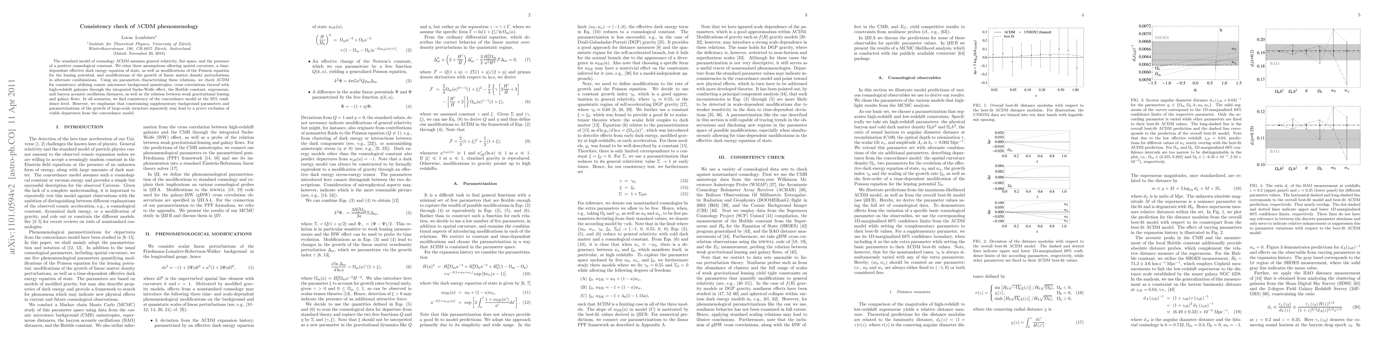 The standard model of cosmology LCDM assumes general relativity, flat space, and the presence of a positive cosmological constant. We relax these assumptions allowing spatial curvature, time-dependent effective dark energy equation of state, as well as modifications of the Poisson equation for the lensing potential, and modifications of the growth of linear matter density perturbations in alternate combinations. Using six parameters characterizing these relations, we check LCDM for consistency utilizing cosmic microwave background anisotropies, cross correlations thereof with high-redshift galaxies through the integrated Sachs-Wolfe effect, the Hubble constant, supernovae and baryon acoustic oscillation distances, as well as the relation between weak gravitational lensing and galaxy flows. In all scenarios, we find consistency of the concordance model at the 95% confidence level. However, we emphasize that constraining supplementary background parameters and parametrizations of the growth of large-scale structure separately may lead to a priori exclusion of viable departures from the concordance model.