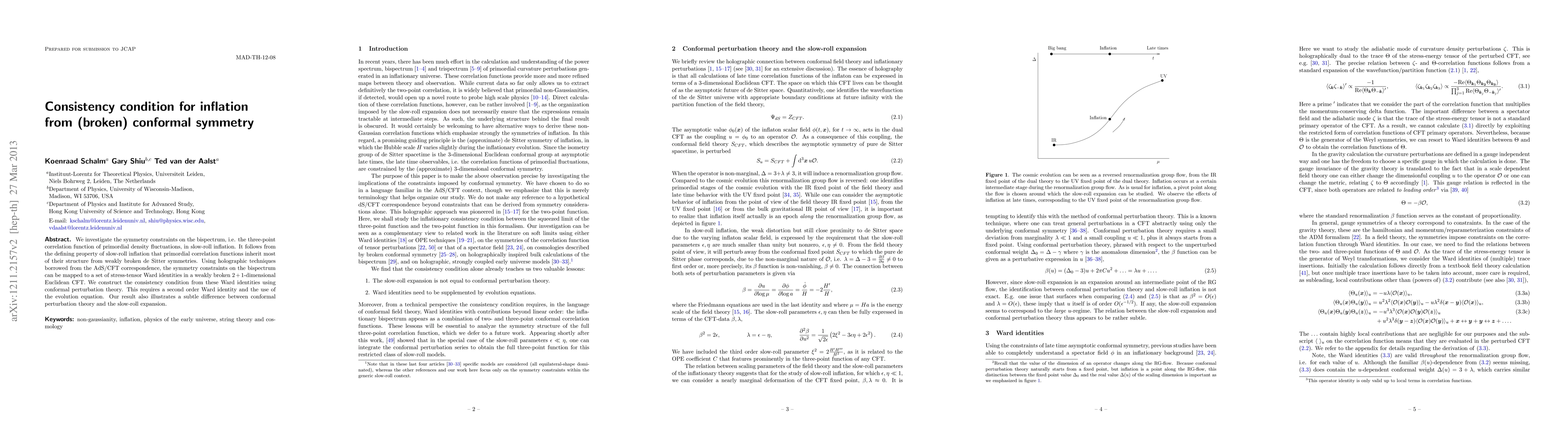 We investigate the symmetry constraints on the bispectrum, i.e. the three-point correlation function of primordial density fluctuations, in slow-roll inflation. It follows from the defining property of slow-roll inflation that primordial correlation functions inherit most of their structure from weakly broken de Sitter symmetries. Using holographic techniques borrowed from the AdS/CFT correspondence, the symmetry constraints on the bispectrum can be mapped to a set of stress-tensor Ward identities in a weakly broken 2+1-dimensional Euclidean CFT. We construct the consistency condition from these Ward identities using conformal perturbation theory. This requires a second order Ward identity and the use of the evolution equation. Our result also illustrates a subtle difference between conformal perturbation theory and the slow roll expansion.