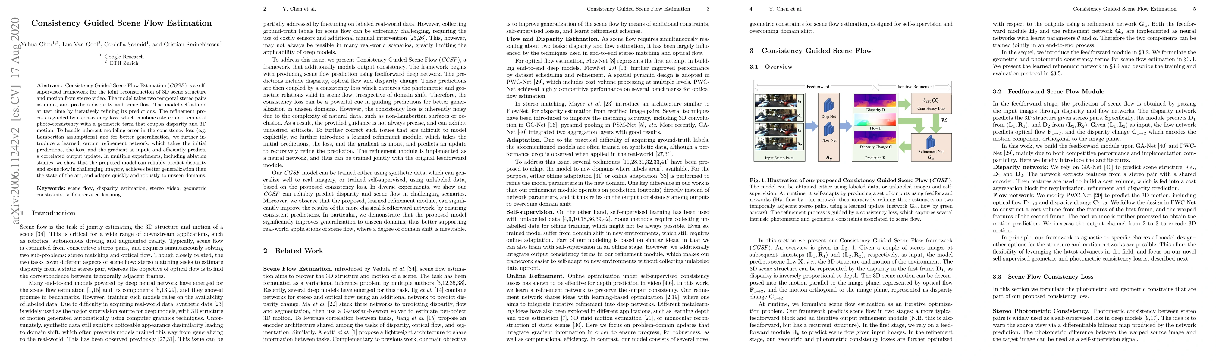 Consistency Guided Scene Flow Estimation (CGSF) is a self-supervised framework for the joint reconstruction of 3D scene structure and motion from stereo video. The model takes two temporal stereo pairs as input, and predicts disparity and scene flow. The model self-adapts at test time by iteratively refining its predictions. The refinement process is guided by a consistency loss, which combines stereo and temporal photo-consistency with a geometric term that couples disparity and 3D motion. To handle inherent modeling error in the consistency loss (e.g. Lambertian assumptions) and for better generalization, we further introduce a learned, output refinement network, which takes the initial predictions, the loss, and the gradient as input, and efficiently predicts a correlated output update. In multiple experiments, including ablation studies, we show that the proposed model can reliably predict disparity and scene flow in challenging imagery, achieves better generalization than the state-of-the-art, and adapts quickly and robustly to unseen domains.