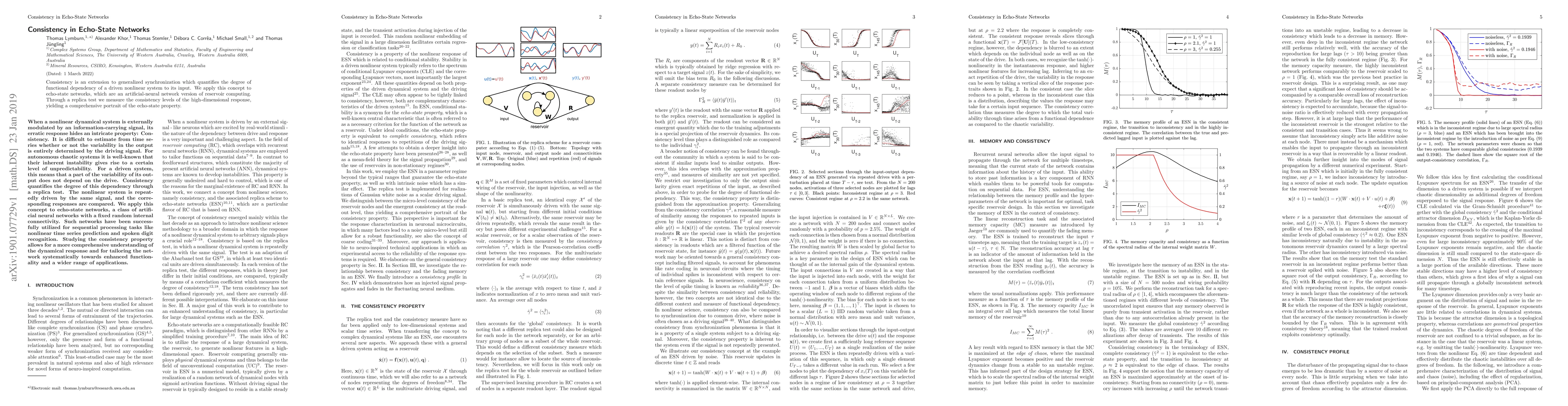 This paper explores consistency in echo-state networks (ESNs), extending generalized synchronization to quantify the functional dependency of ESNs on their inputs. Using a replica test, the authors measure consistency levels in the high-dimensional responses, providing insights into the ESN's reservoir computing properties.
